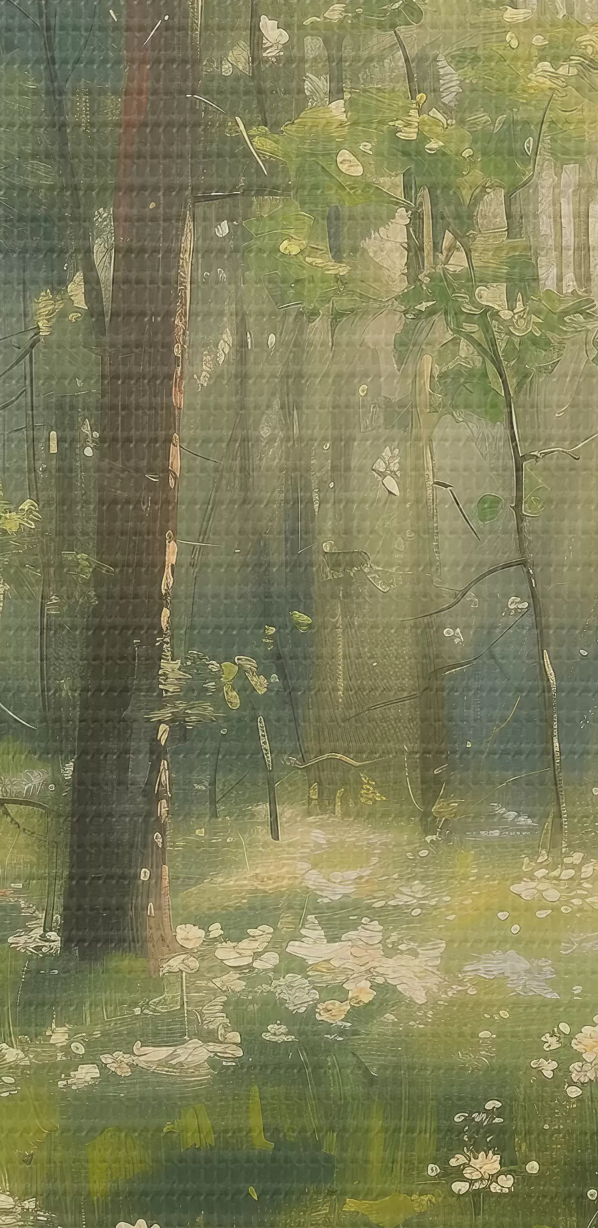 Obraz Les so slnečným svetlom na stromoch, kvety harmančeka, zelená tráva, akrylová kresba Nr. s40226
