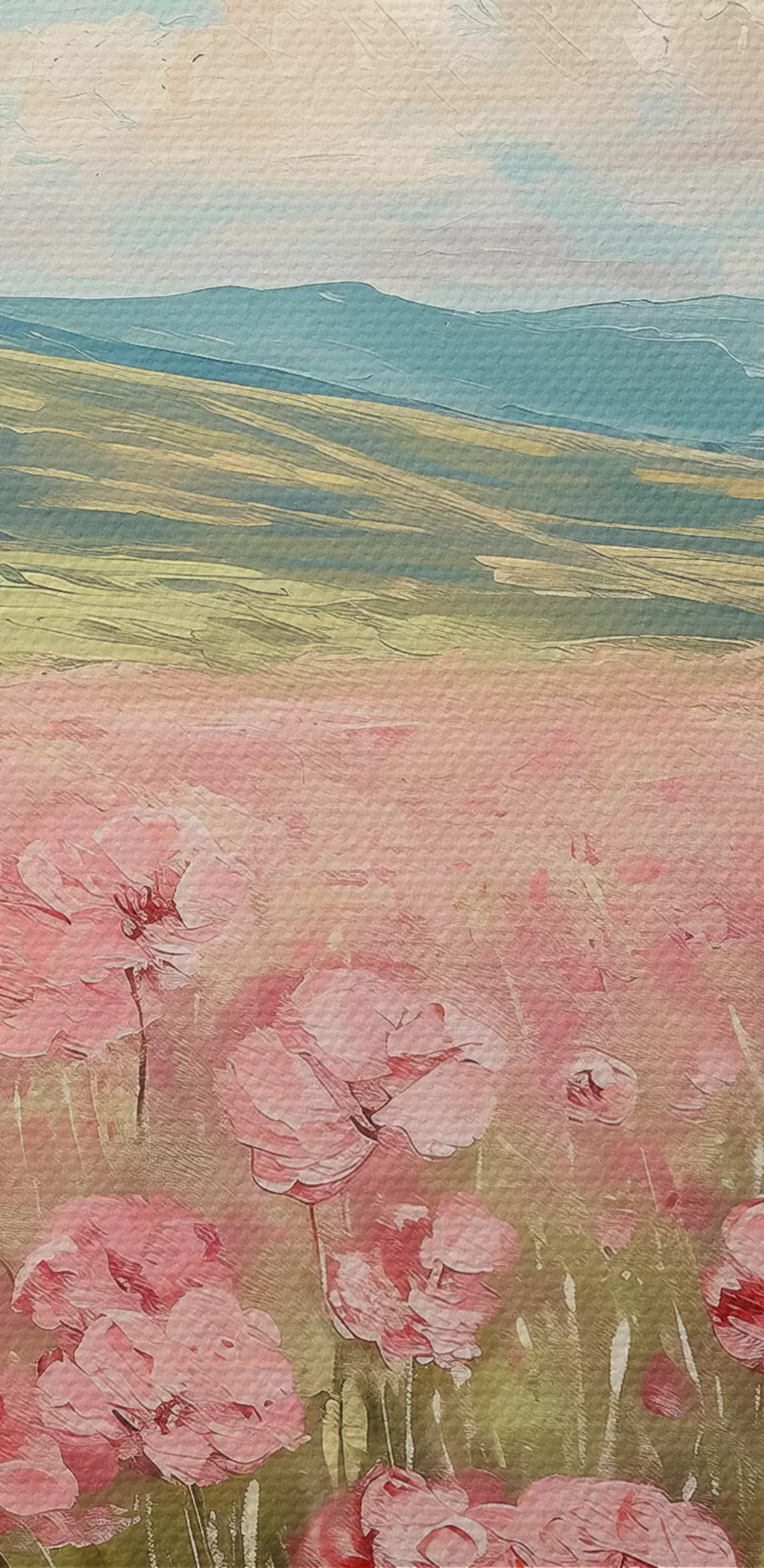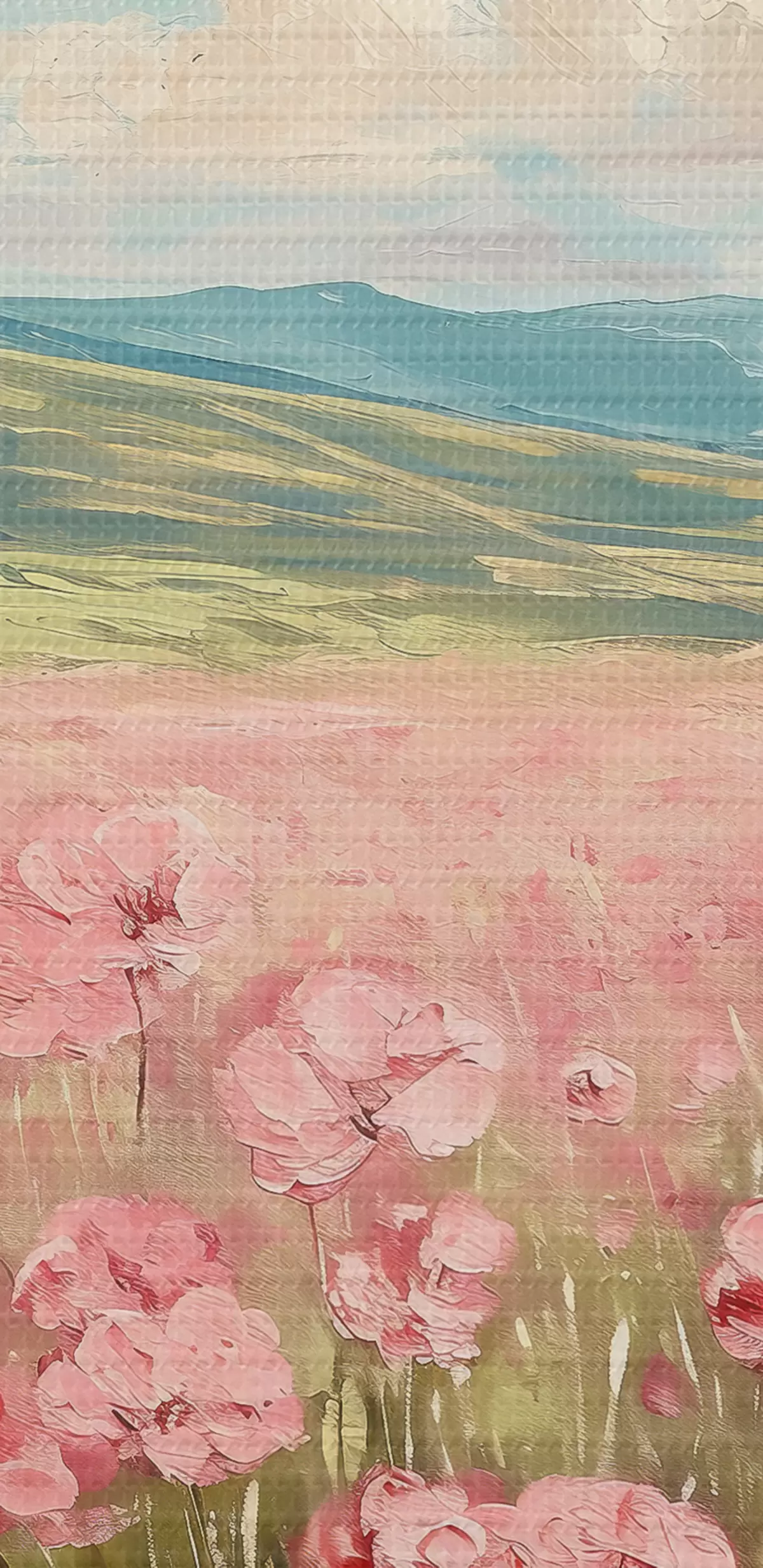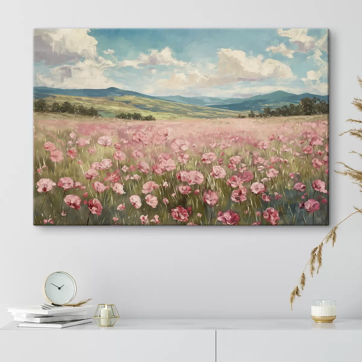 Obraz Lúka s ružovými kvetmi, hory, prírodná krajina, modrá obloha s oblakmi, akryl Nr. s40232
