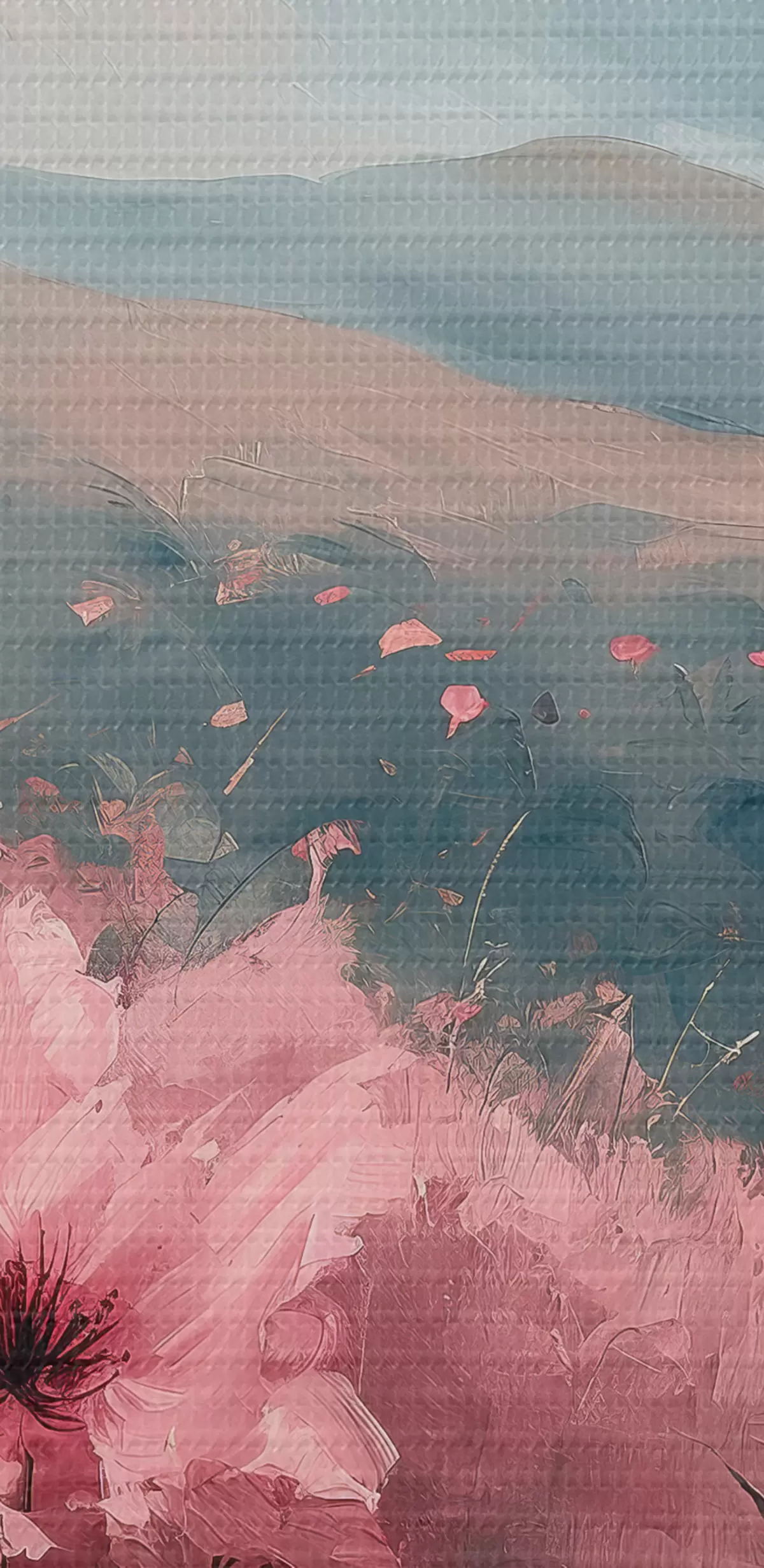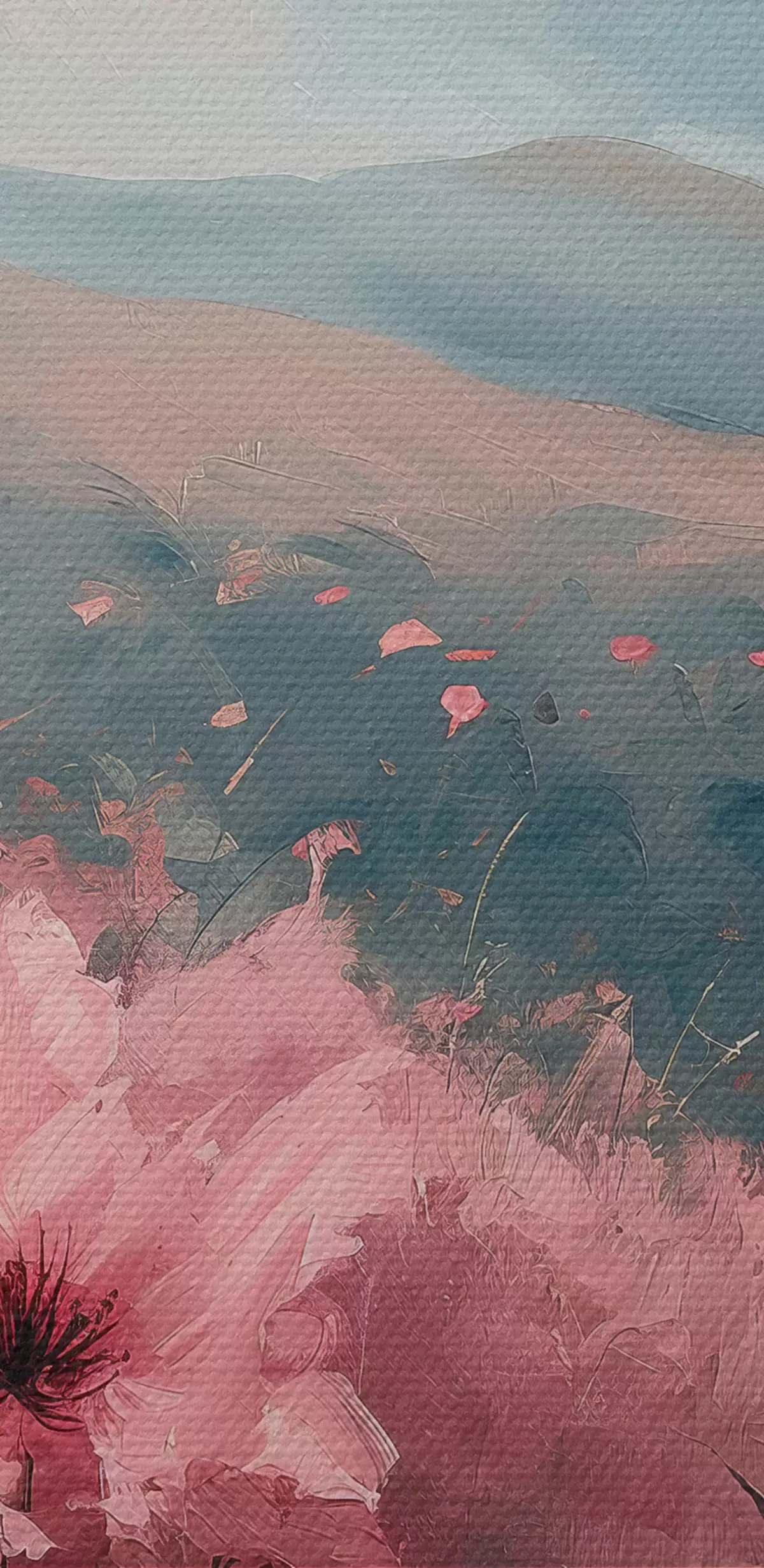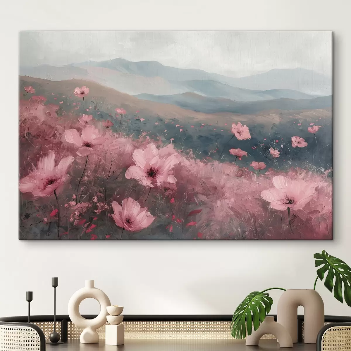 Obraz Ružové kvety na lúke, prírodná krajina, hory, olejomaľba, živé ťahy štetcom Nr. s40233