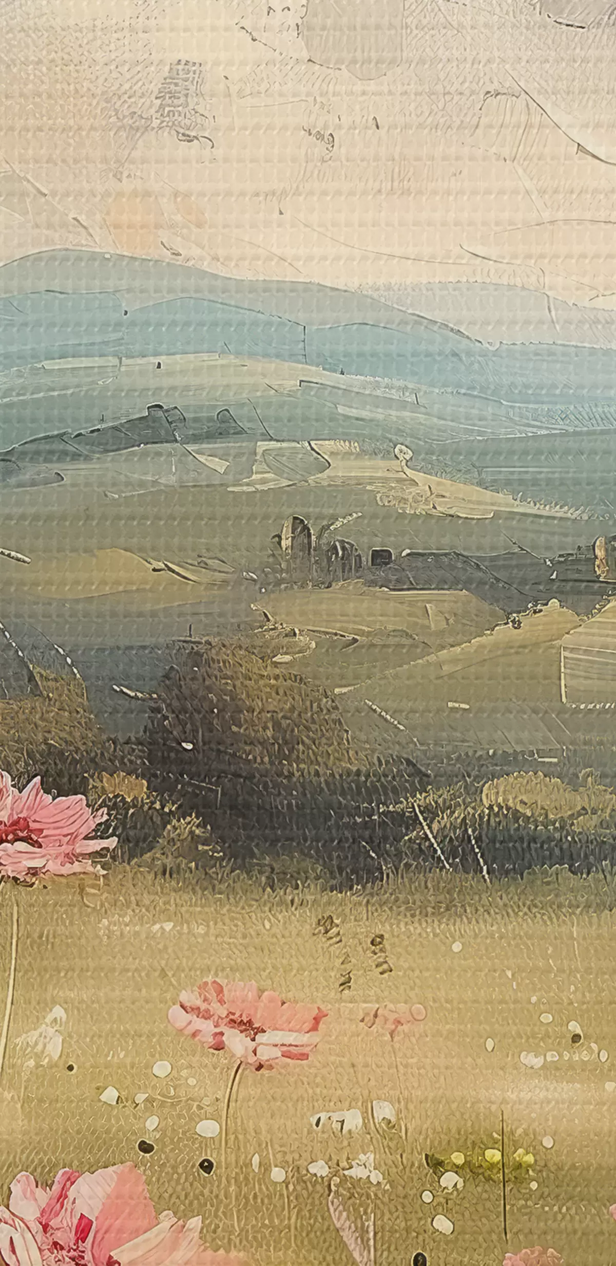 Obraz Lúka s ružovými kvetmi, zelená tráva, prírodná krajina, obloha s oblakmi, kresba akrylom Nr. s40234