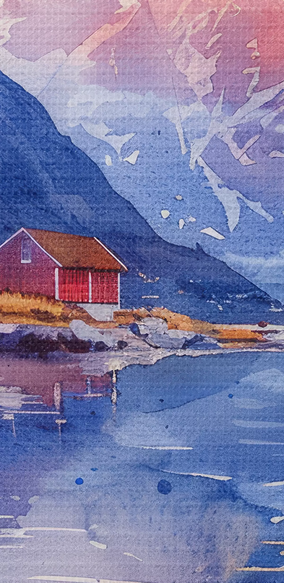 Obraz Nórska dedina, západ slnka, pokojná rieka, hory, akvarel Nr. s40311