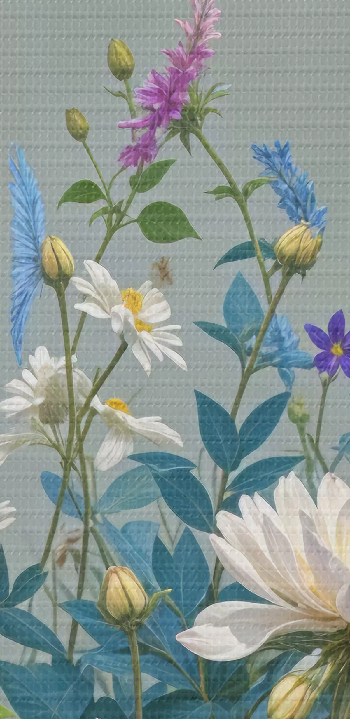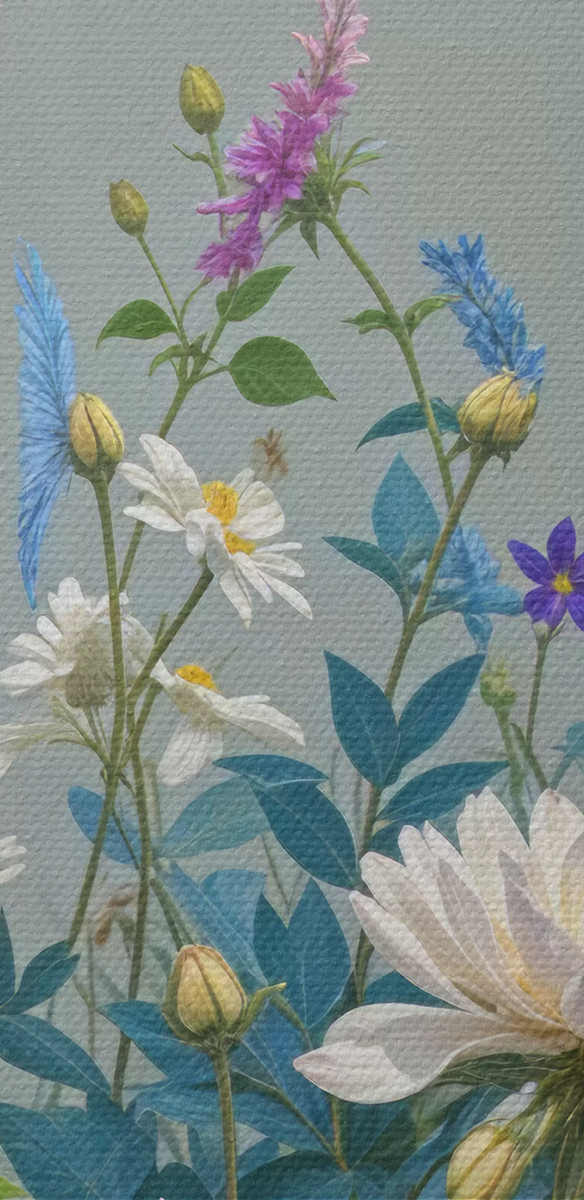 Obraz Svieža, pulzujúca záhrada plná rôznych farebných kvetov a kvitnúcich rastlín na sivom pozadí Nr. s40393