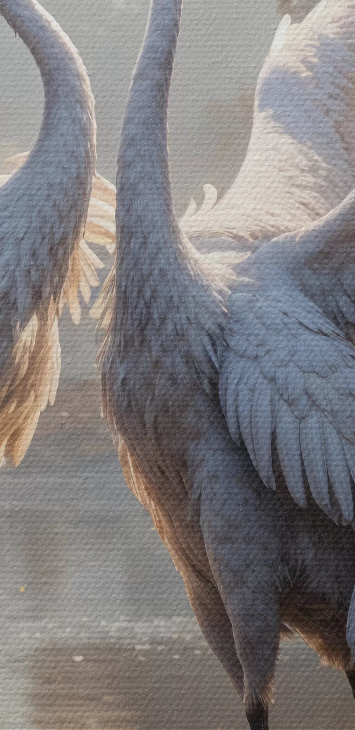 Obraz Dva veľké sivé žeriavy s dlhými krkmi a krídlami stojace v hmlistom jazere obklopenom stromami Nr. s40404
