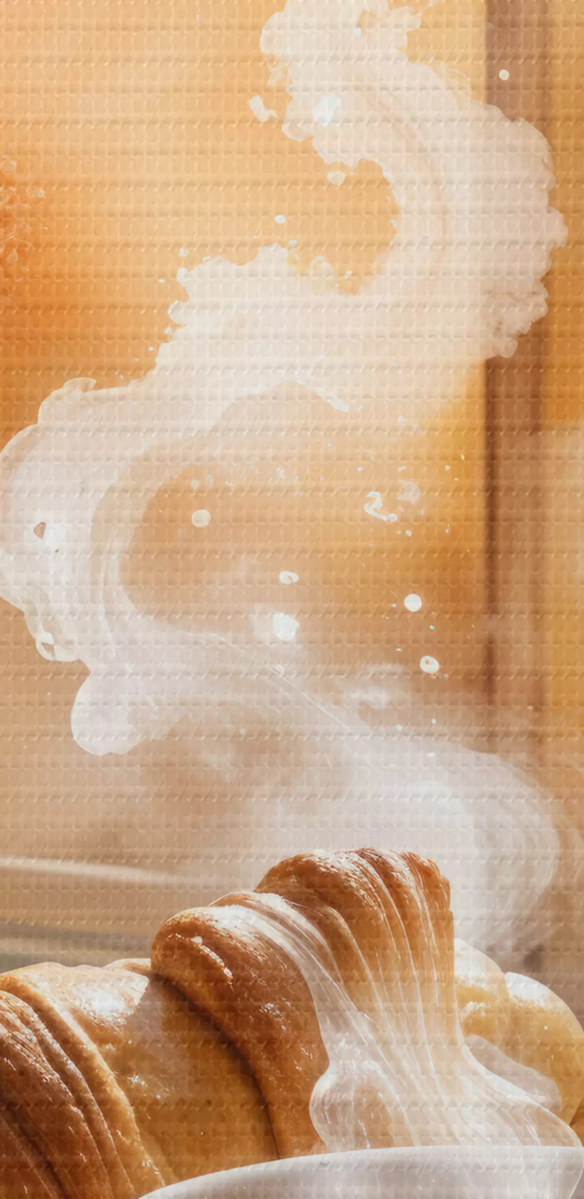 Obraz Teplá šálka kávy so stúpajúcou parou, položená na stole vedľa croissantu, s výhľadom na historickú budovu Nr. s40405