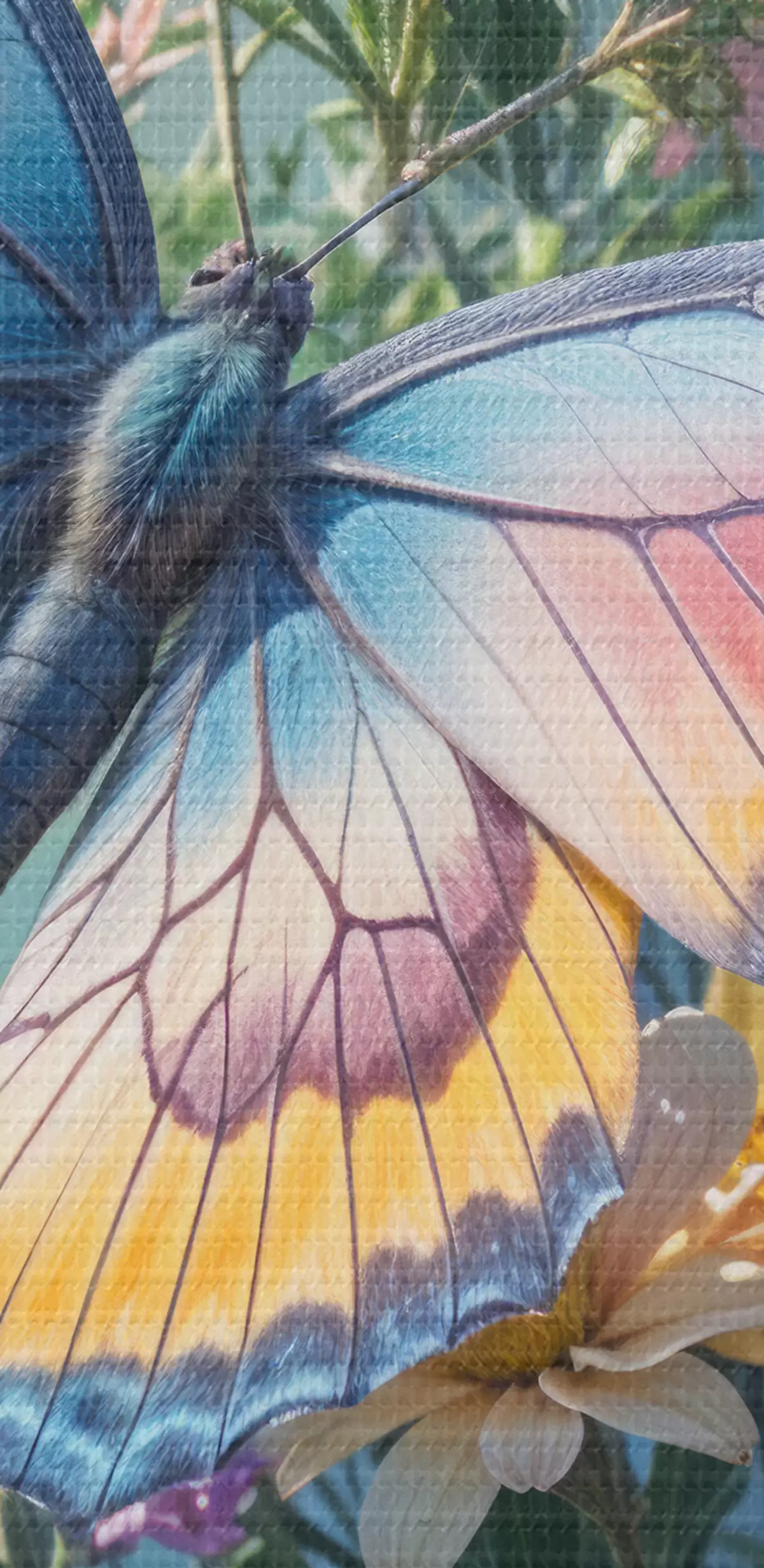 Obraz Veľký farebný motýľ sediaci na kytici ružových a žltých kvetov na tmavozelenom pozadí Nr. s40411