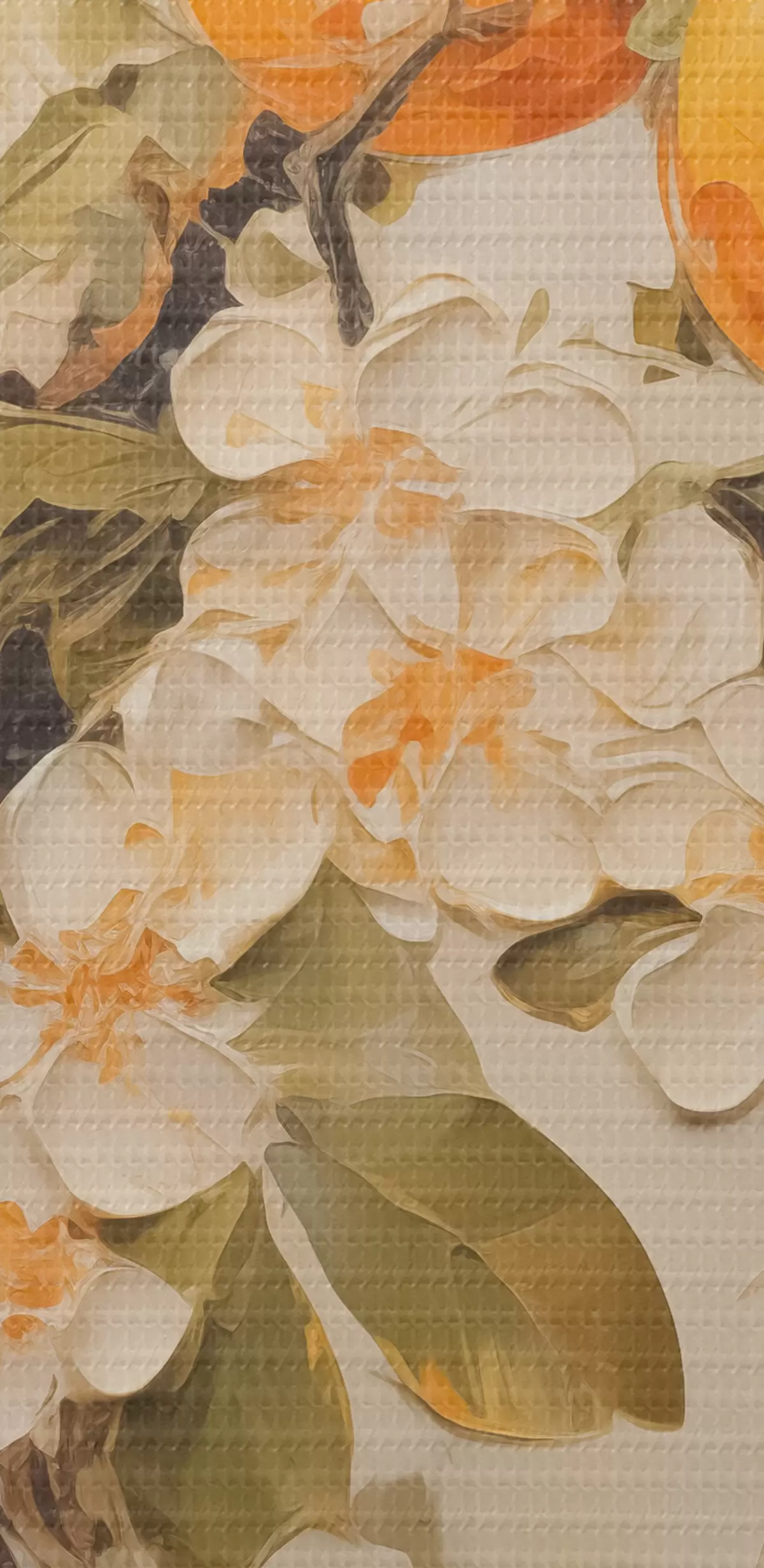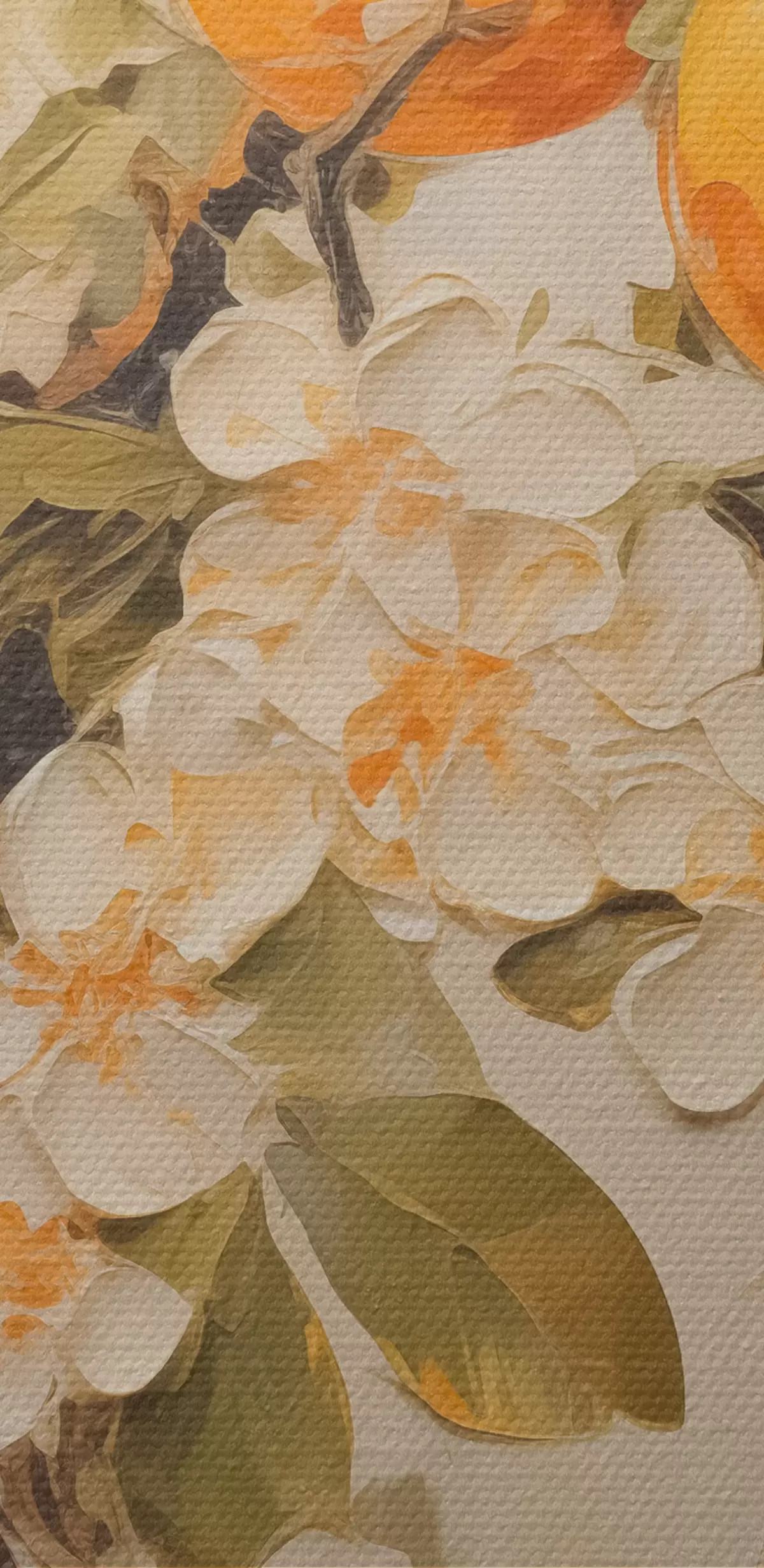 Obraz Konár s bielymi kvetmi a pomarančmi na sivo-béžovom podklade Nr. s40486