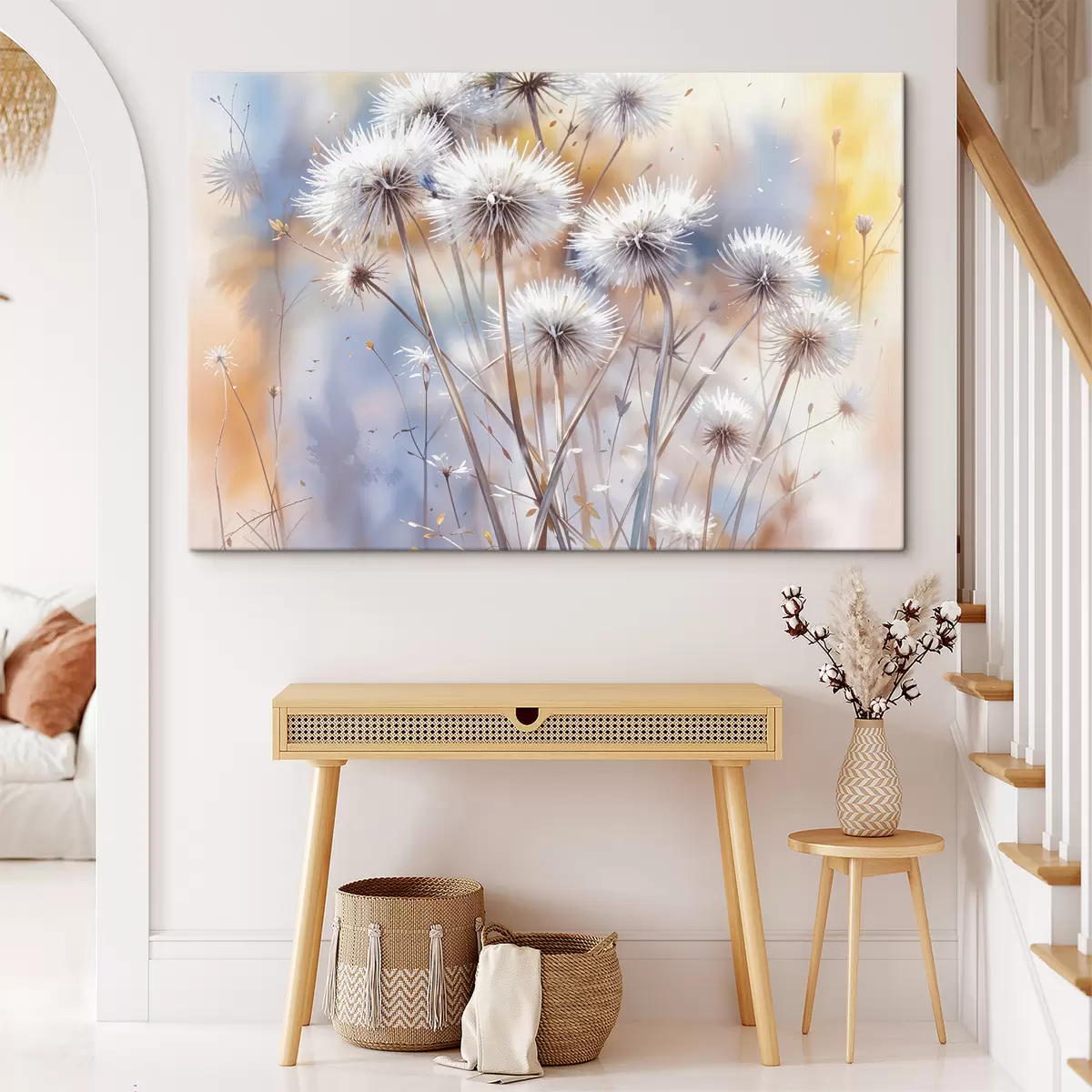 Obraz Nadýchané biele kvety púpavy na rozmazanom akvarelovom pozadí s teplým osvetlením Nr. s40541