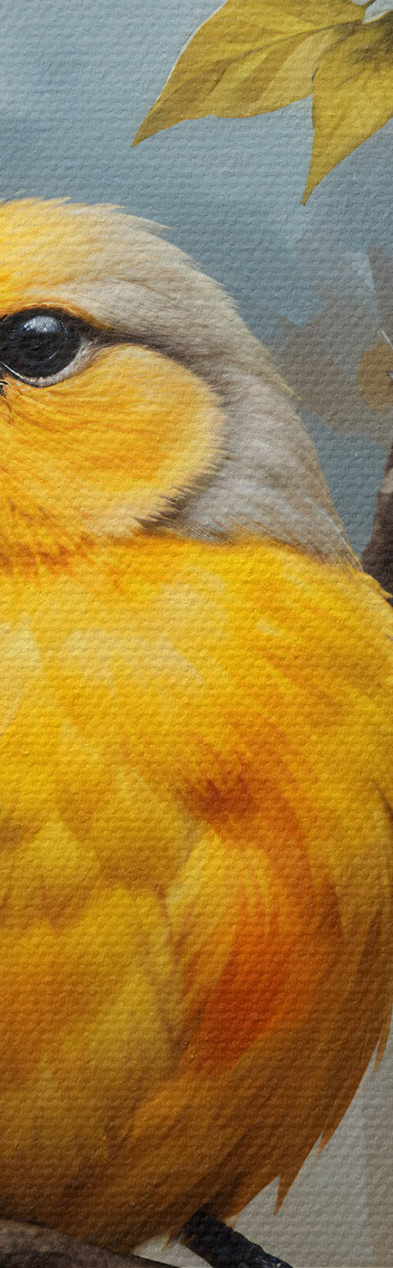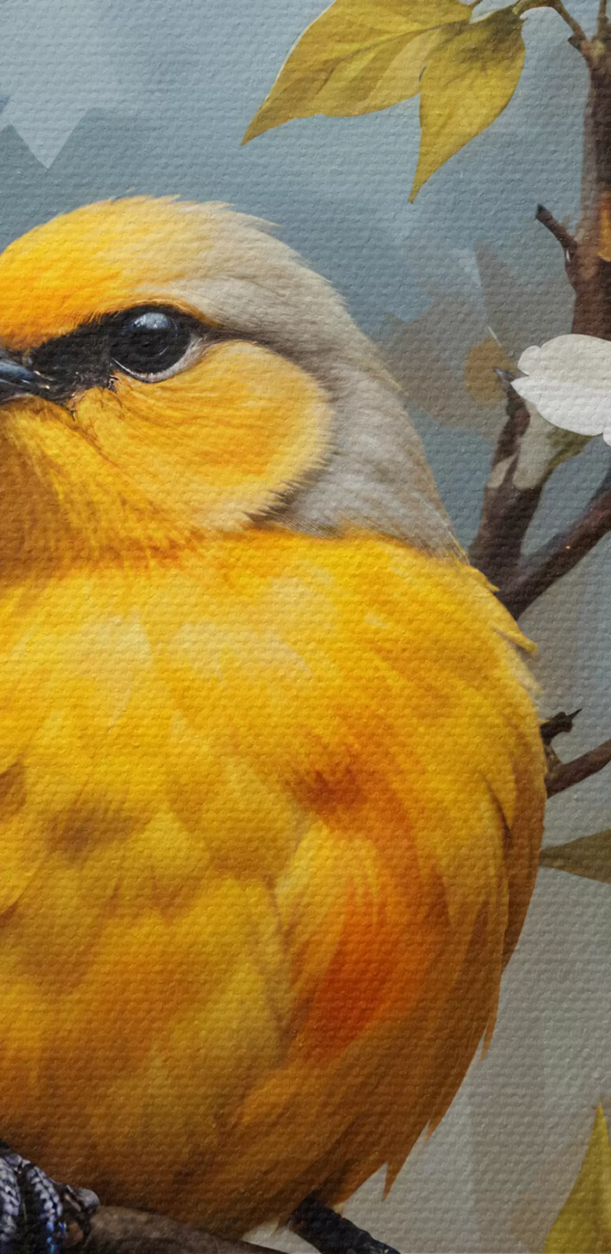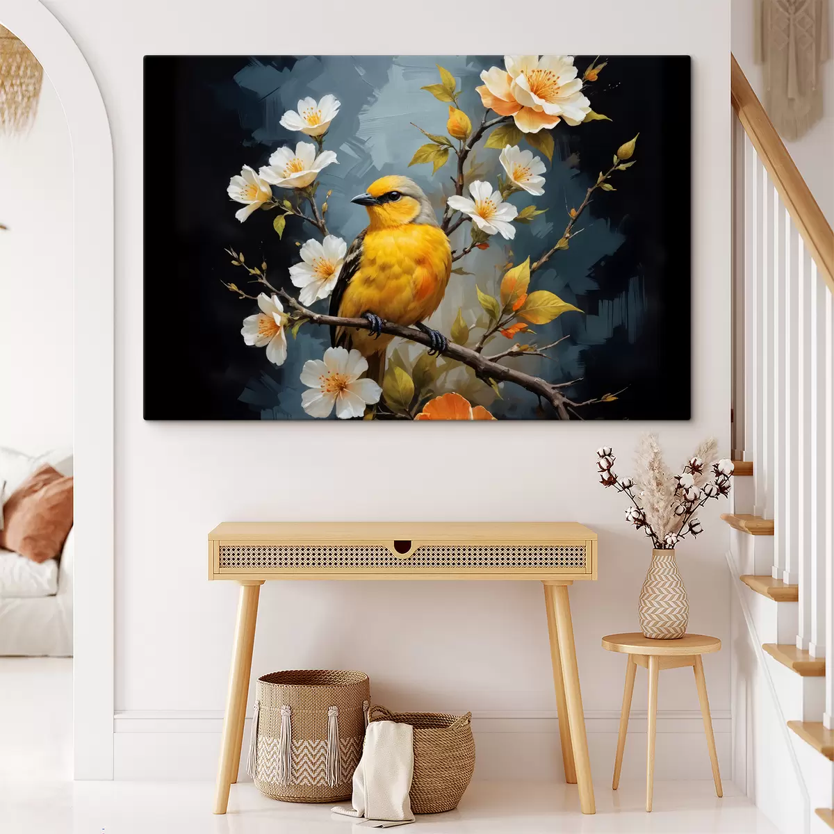 Obraz Žltý vták sediaci na konári s bielymi a oranžovými kvetmi v pozadí Nr. s40550