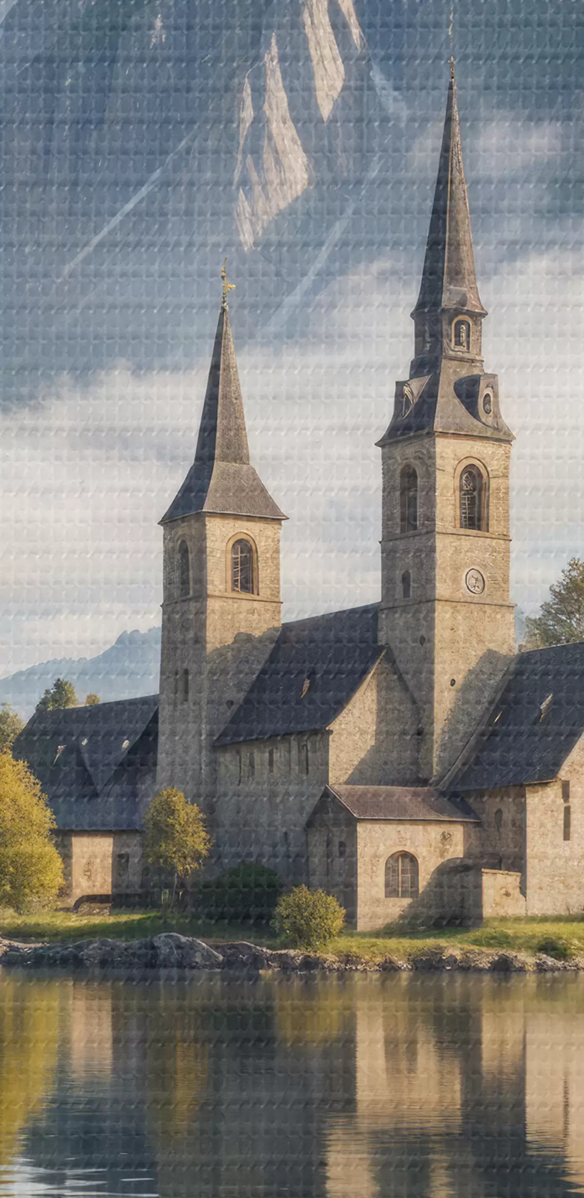 Obraz Malebná alpská dedinka ležiaca pri pokojnom jazere s týčiacimi sa zasneženými horami Nr. s40554