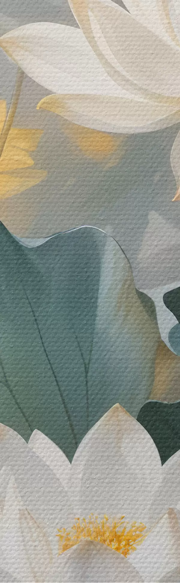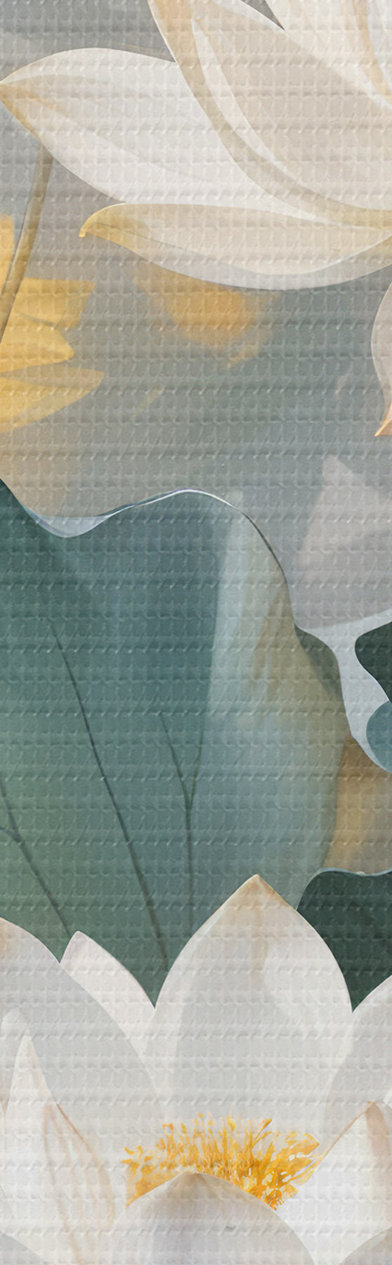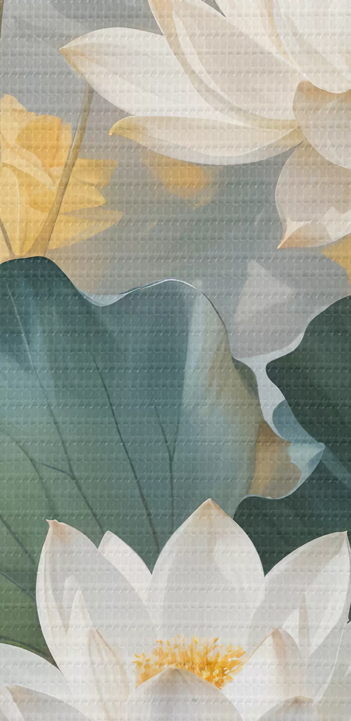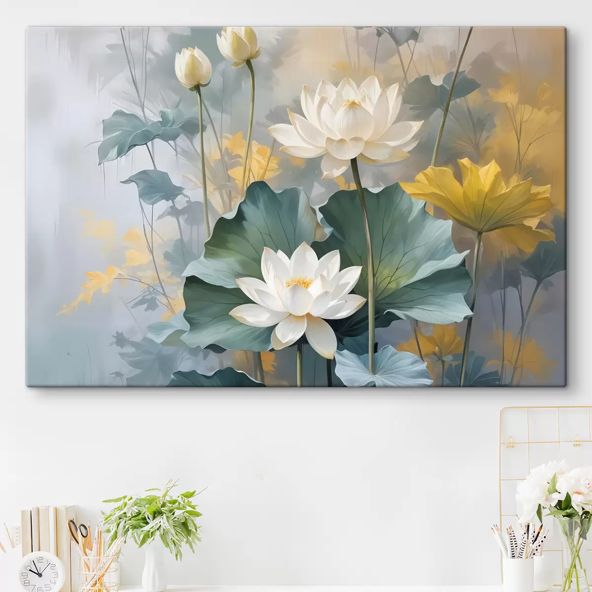 Obraz Biele lotosové kvety v jazierku so zelenými ľaliovými vankúšikmi, obklopené žltými kvetmi a rozmazaným pozadím Nr. s40559