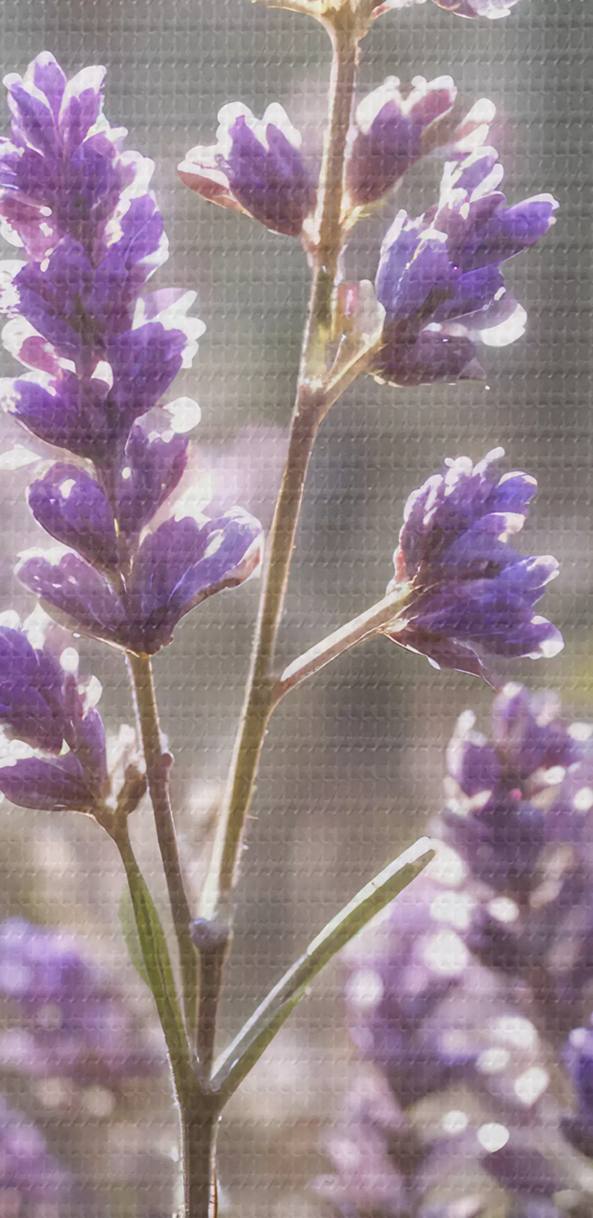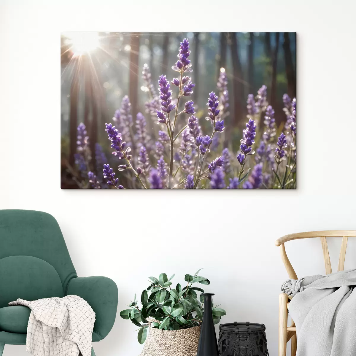 Obraz Fialové kvety levandule na poli s rozmazaným pozadím lesa a prenikaním slnečného svetla Nr. s40570
