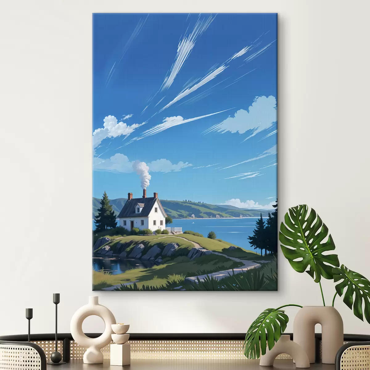 Obraz Biely dom na trávnatom kopci s horami v pozadí a modrou oblohou s mračnami Nr. s40587