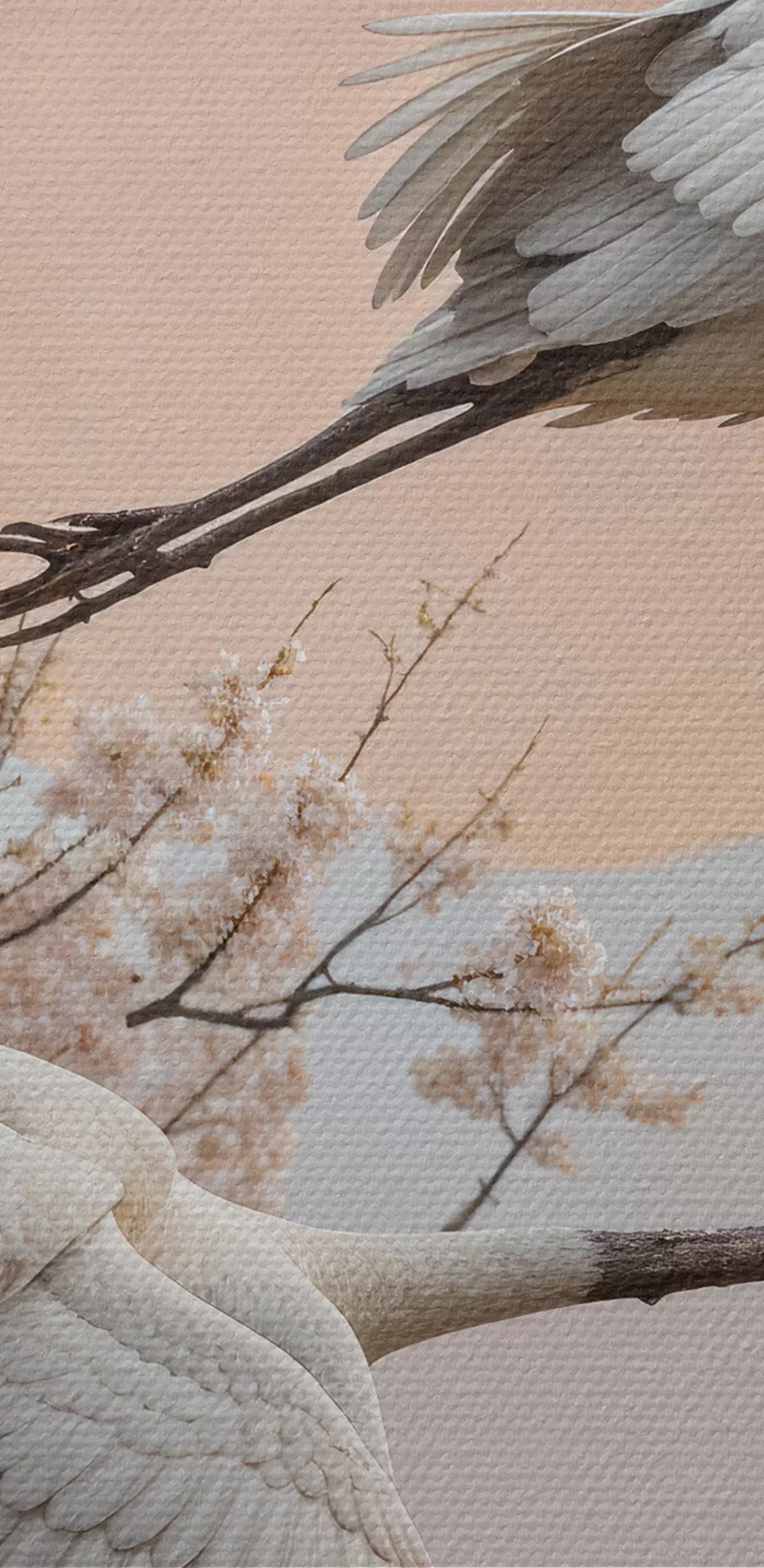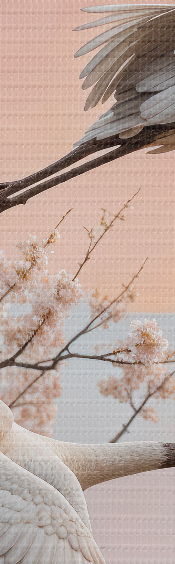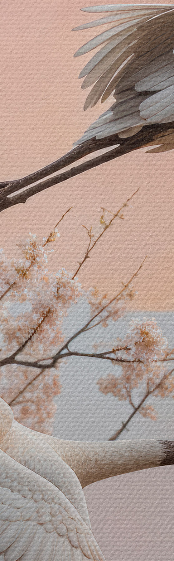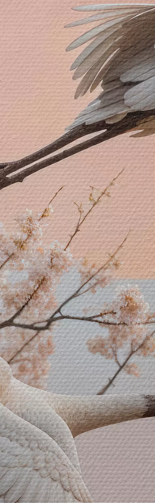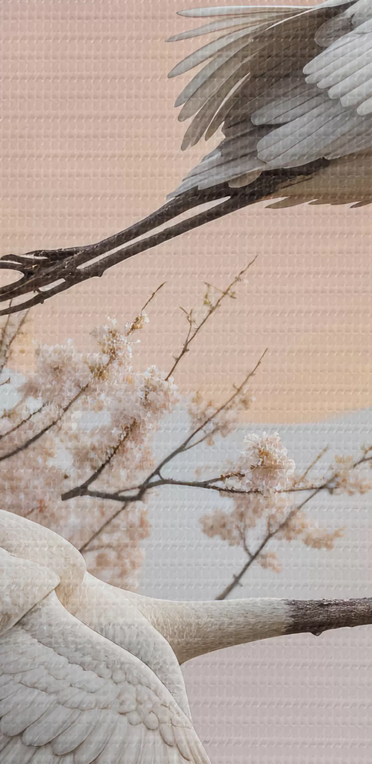 Obraz Dva biele žeriavy letiace medzi rozkvitnutými čerešňami na pozadí ružovej oblohy pri západe slnka Nr. s40601