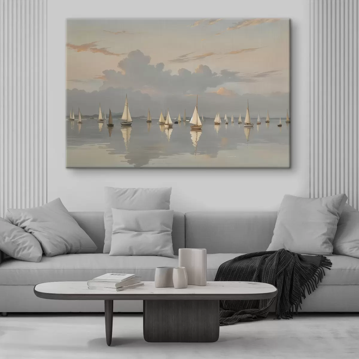 Obraz Flotila bielych plachetníc na pokojnej, zrkadliacej sa vodnej ploche pri západe slnka so zamračenou oblohou v pozadí Nr. s40615