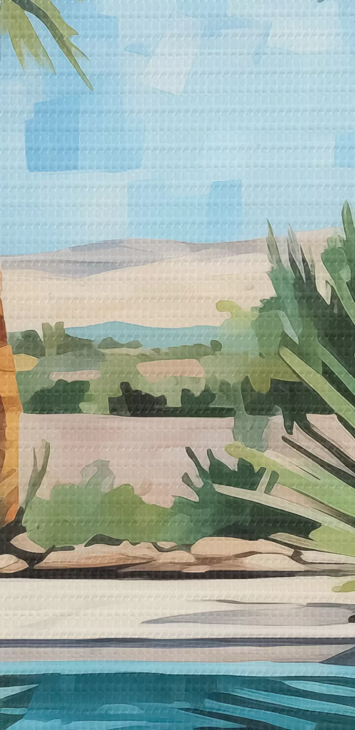 Obraz Palmy v blízkosti hotela s bazénom pri skalách, modrá, zelená, červená farba Nr. s40748