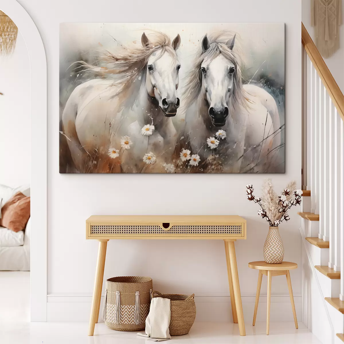 Obraz Pár bielych a sivých koní v blízkosti sedmokrások Nr. s40749