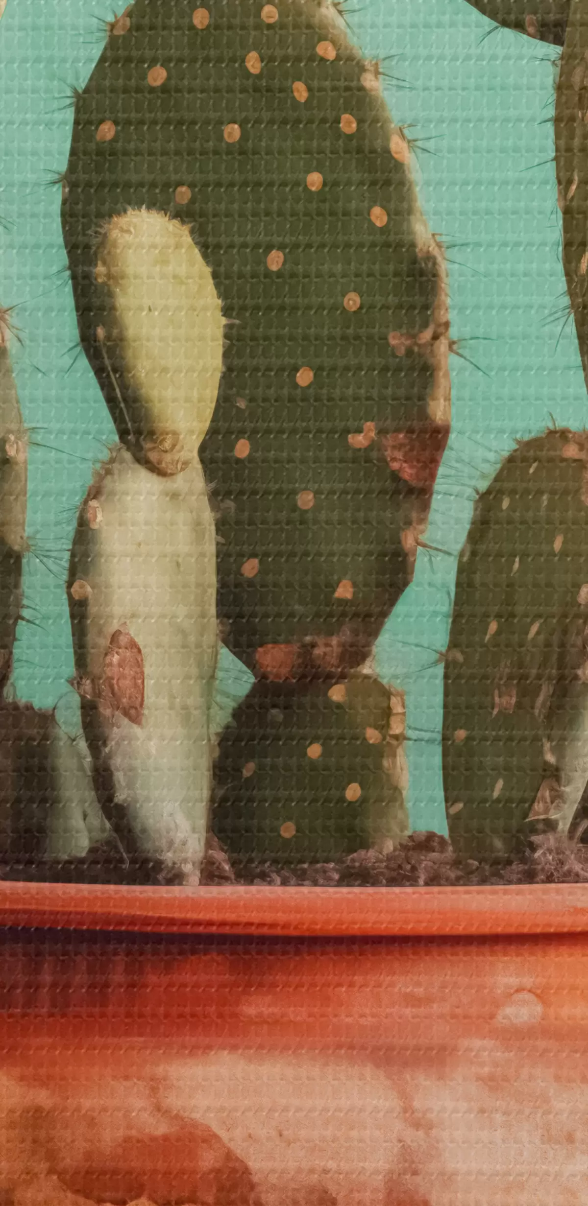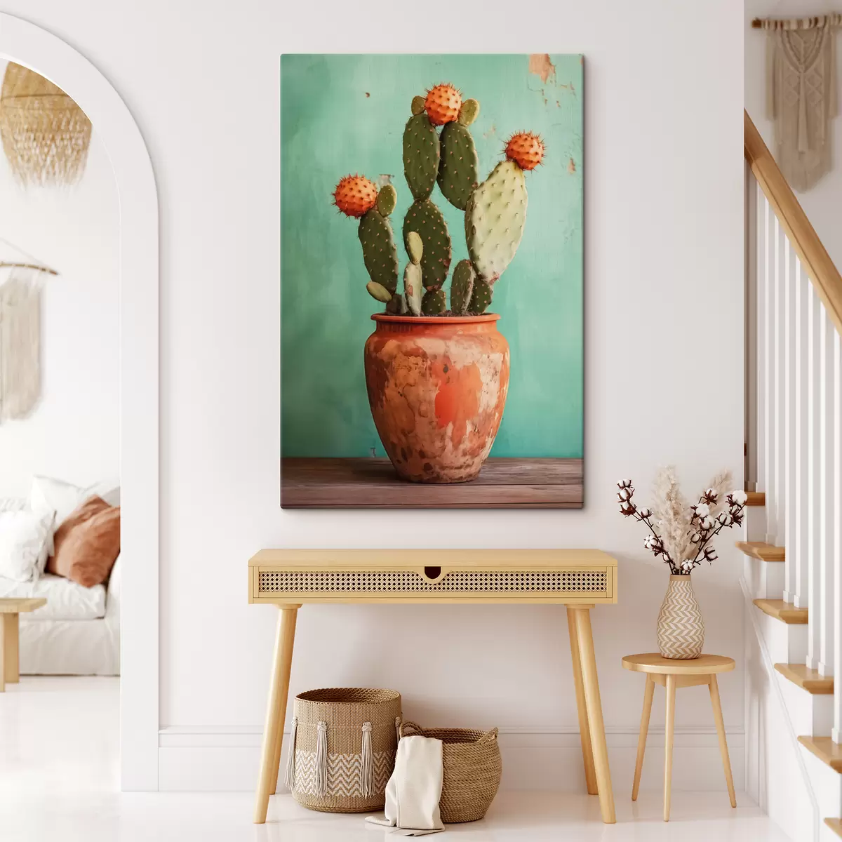 Obraz Kaktus v starom hlinenom kvetináči na pozadí modrozelenej steny Nr. s40807
