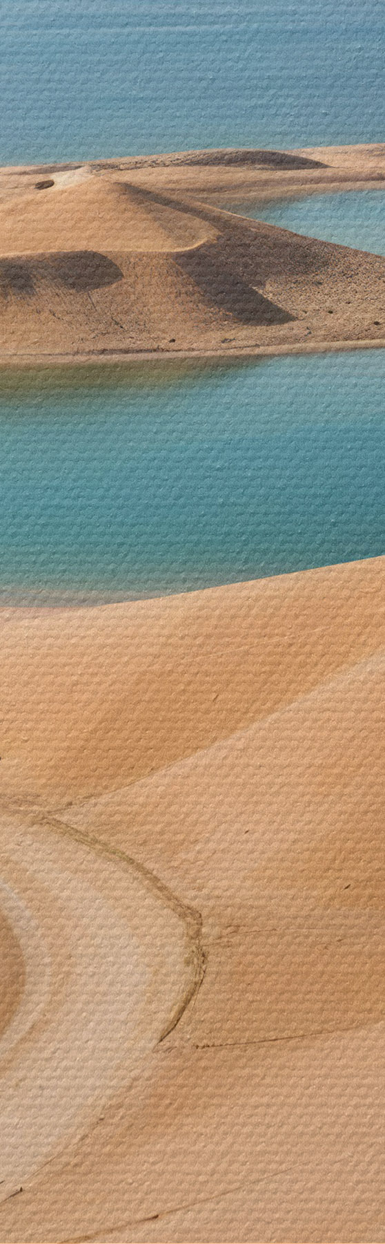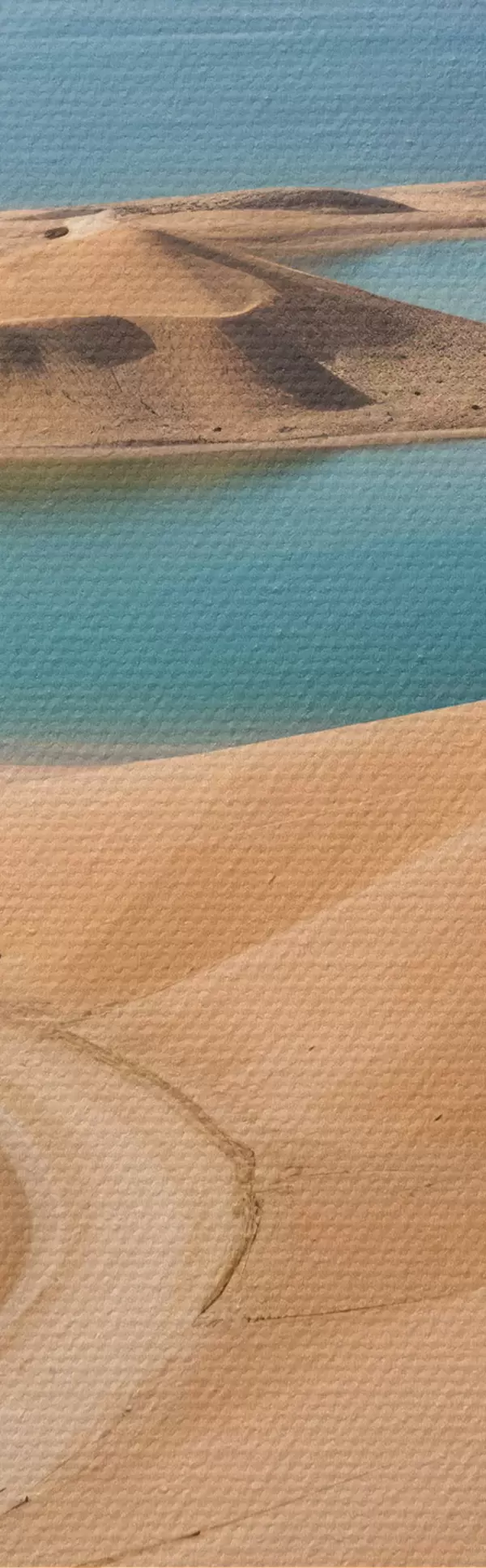Obraz Rozsiahla púštna krajina s vlniacimi sa piesočnými dunami a tyrkysovými jazerami, obklopená drsnými horami Nr. s41087