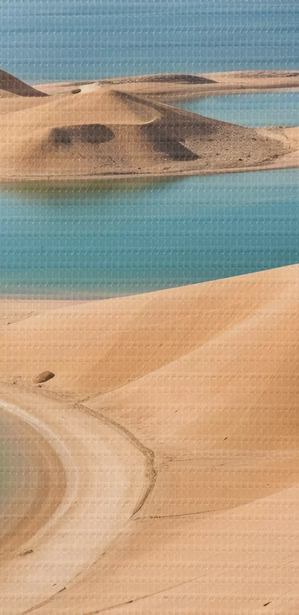 Obraz Rozsiahla púštna krajina s vlniacimi sa piesočnými dunami a tyrkysovými jazerami, obklopená drsnými horami Nr. s41087