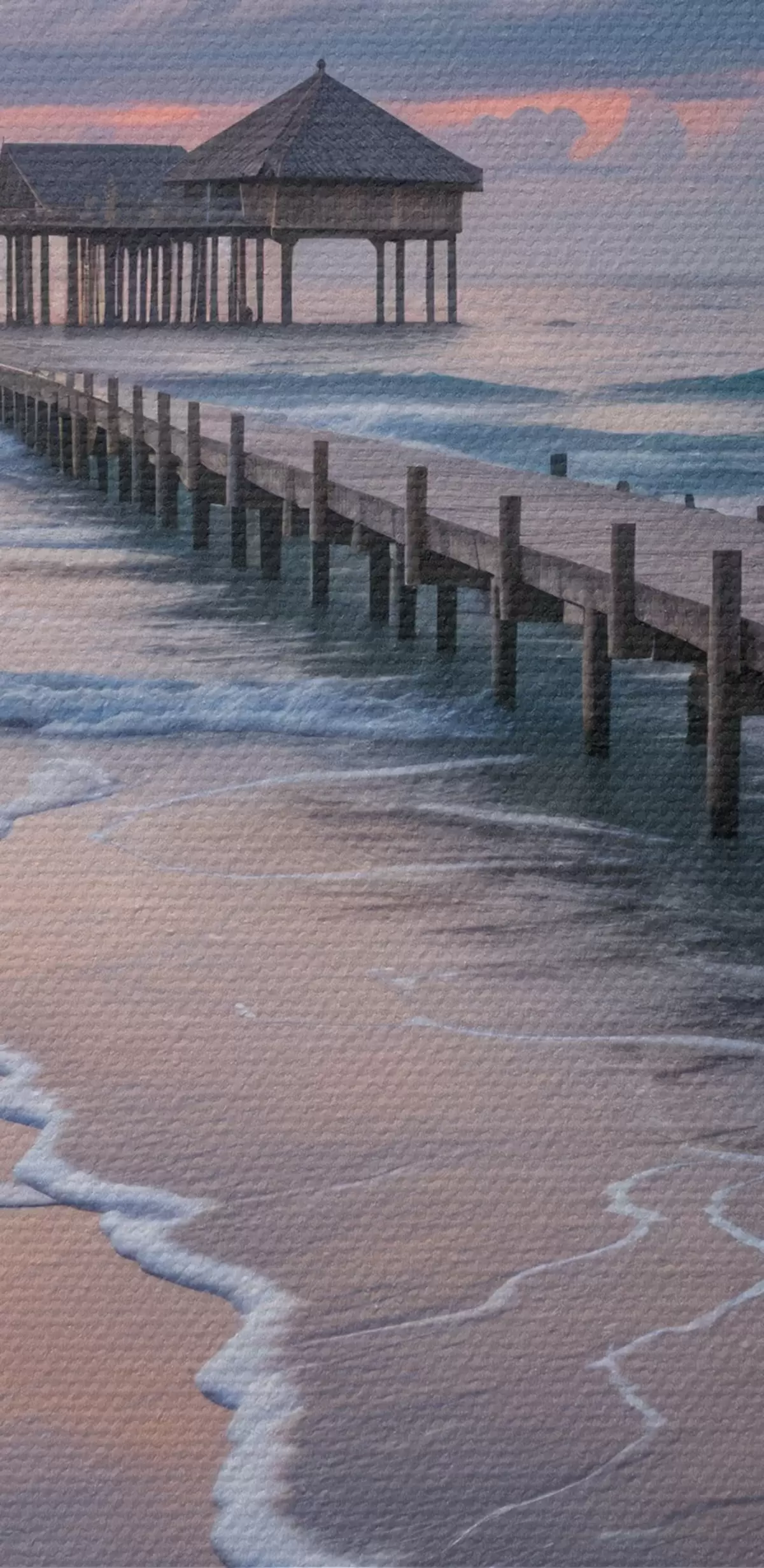 Obraz Drevené mólo zasahujúce do pokojného oceánu pri západe slnka s farebnými mrakmi Nr. s41091