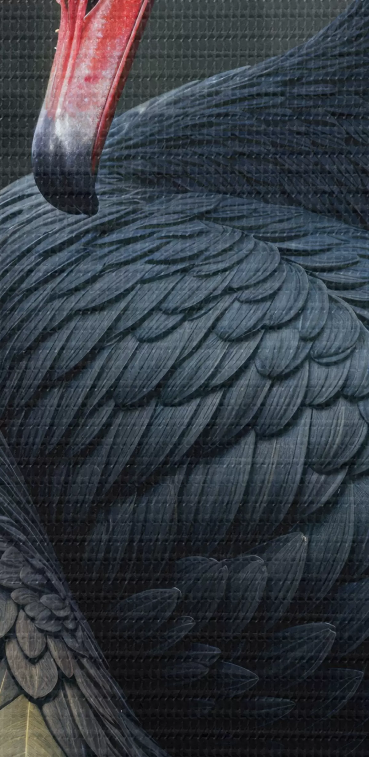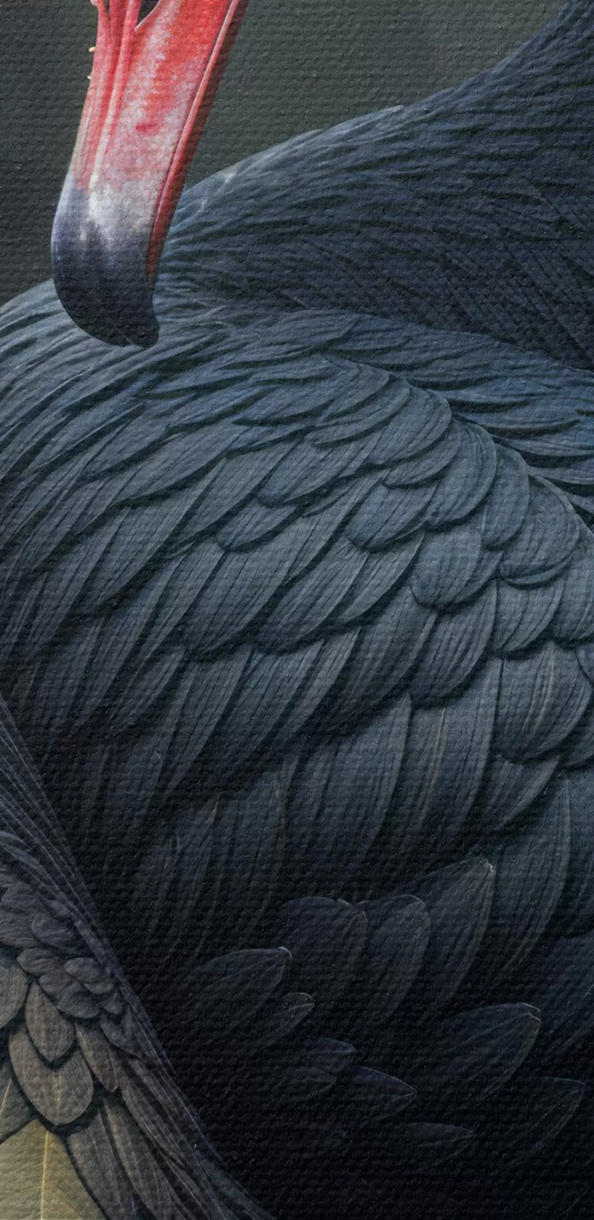 Obraz Čierna labuť s roztiahnutými krídlami, ktorá na tmavom pozadí vyniká nápadným čiernym perím a červeným zobákom Nr. s41249