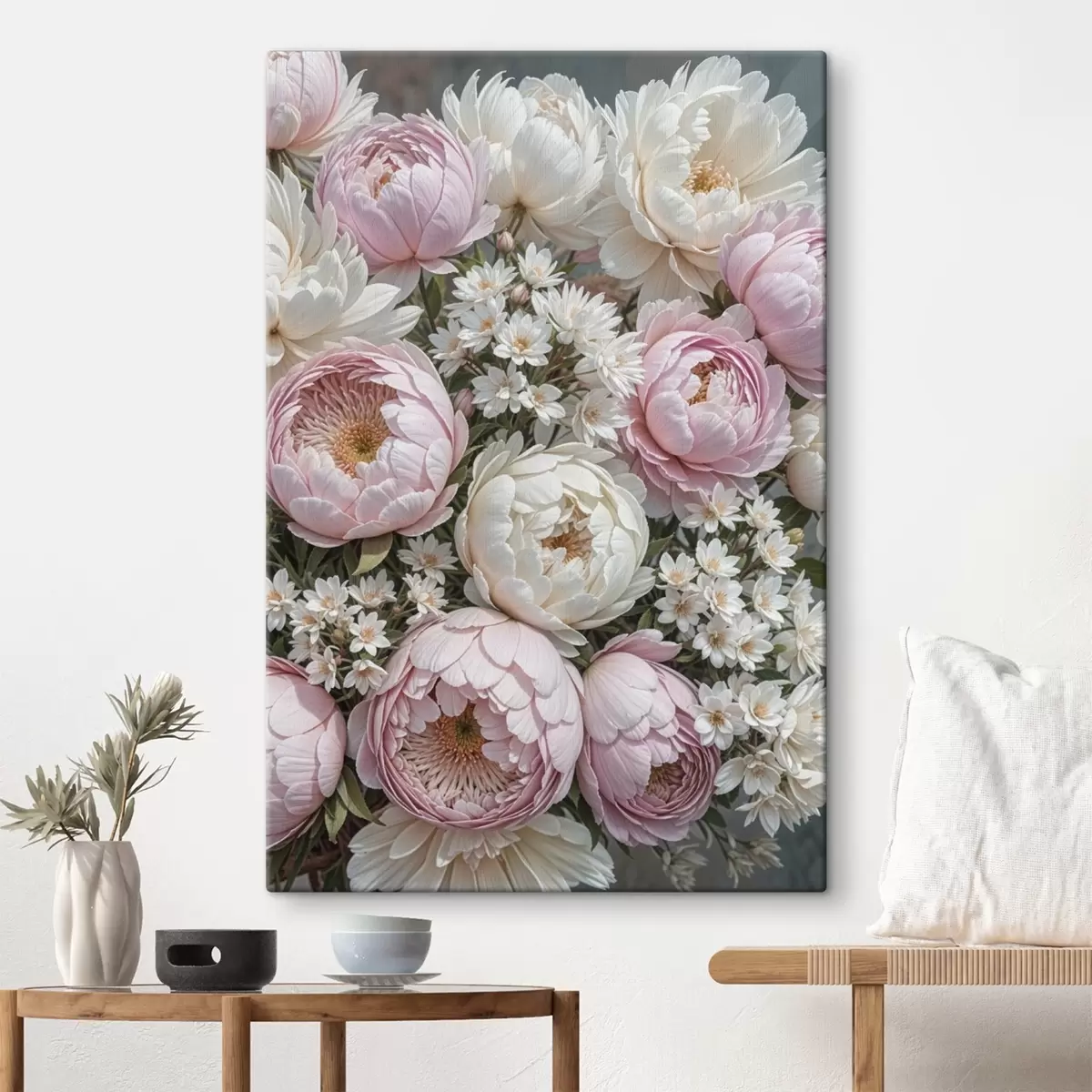 Obraz Kytica pastelových ružových pivoniek a bielych sedmokrások naaranžovaná v krásnej kvetinovej kompozícii Nr. s41255