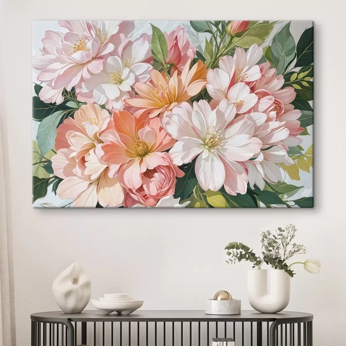 Obraz Žiarivá kytica veľkých ružových, bielych a oranžových kvetov georgín so zelenými listami na jemnom ružovom pozadí Nr. s41267