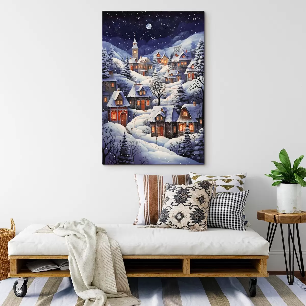 Obraz Zimná krajina so zasneženými vidieckymi domami na pozadí nočnej hviezdnej oblohy Nr. s41275