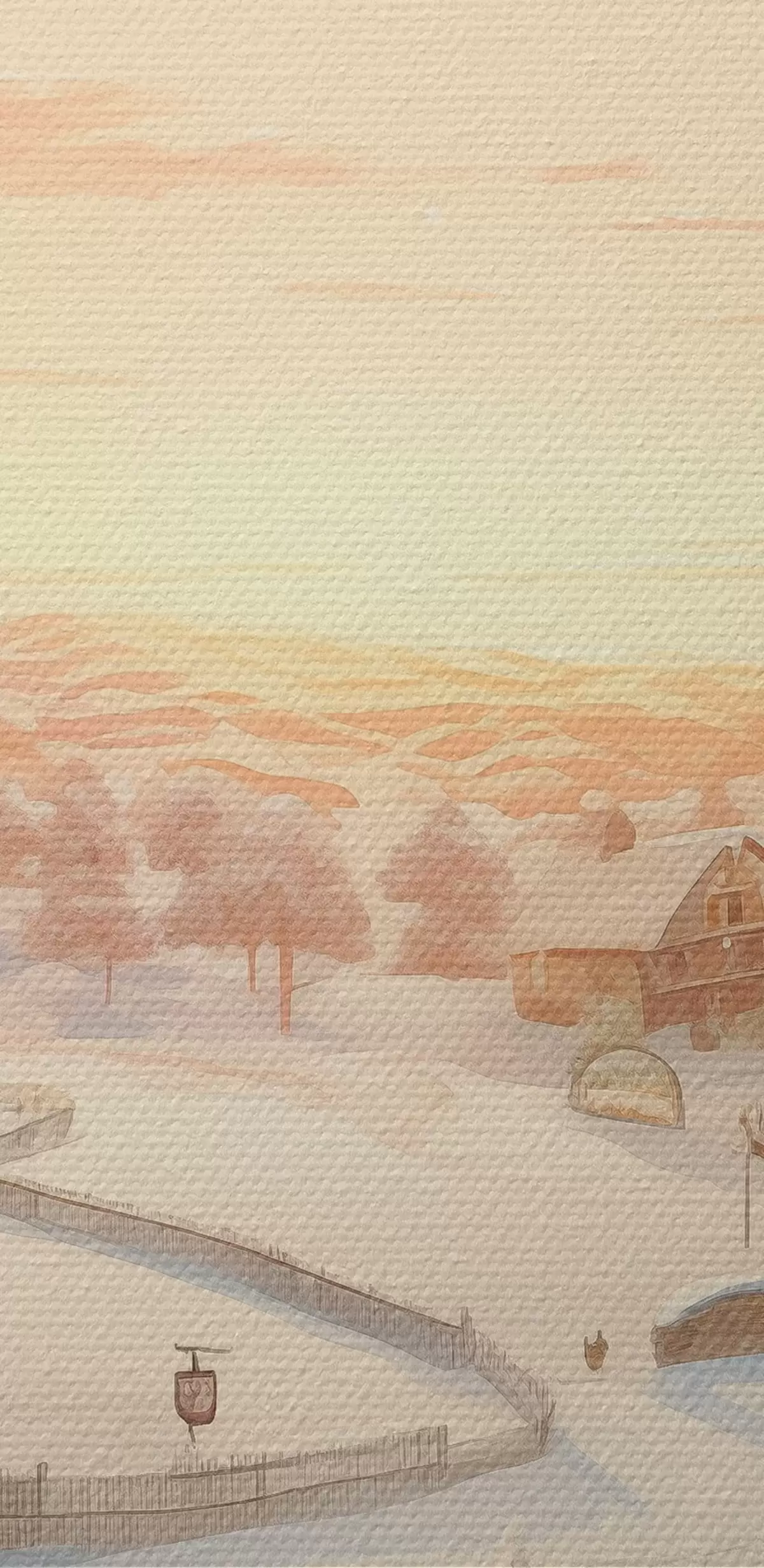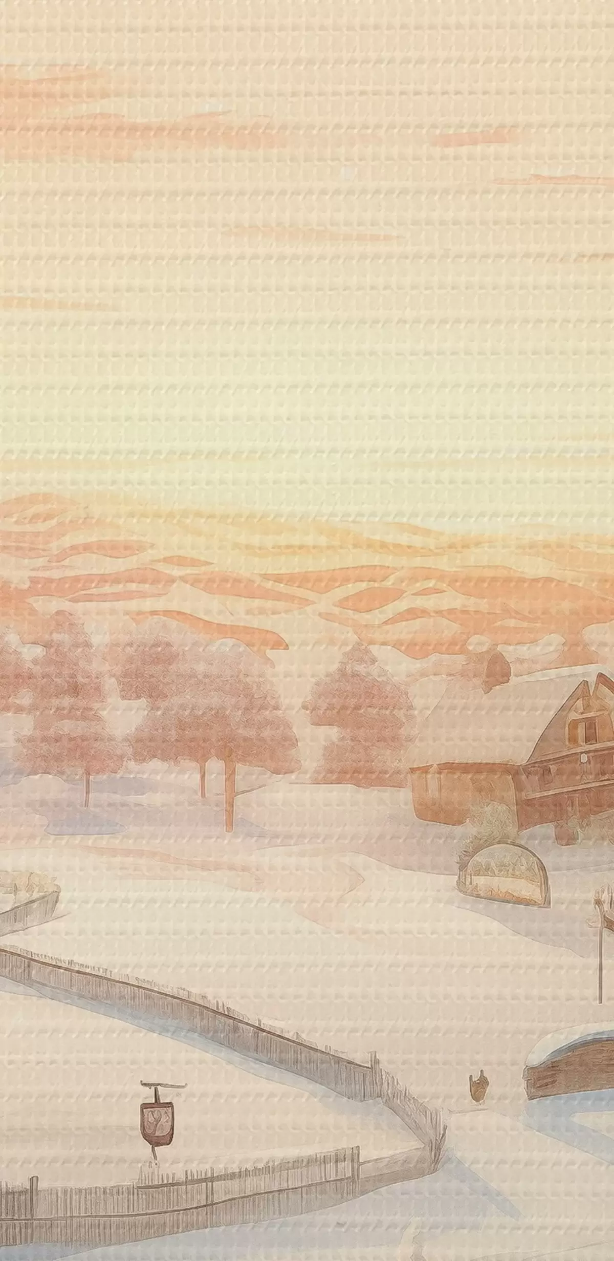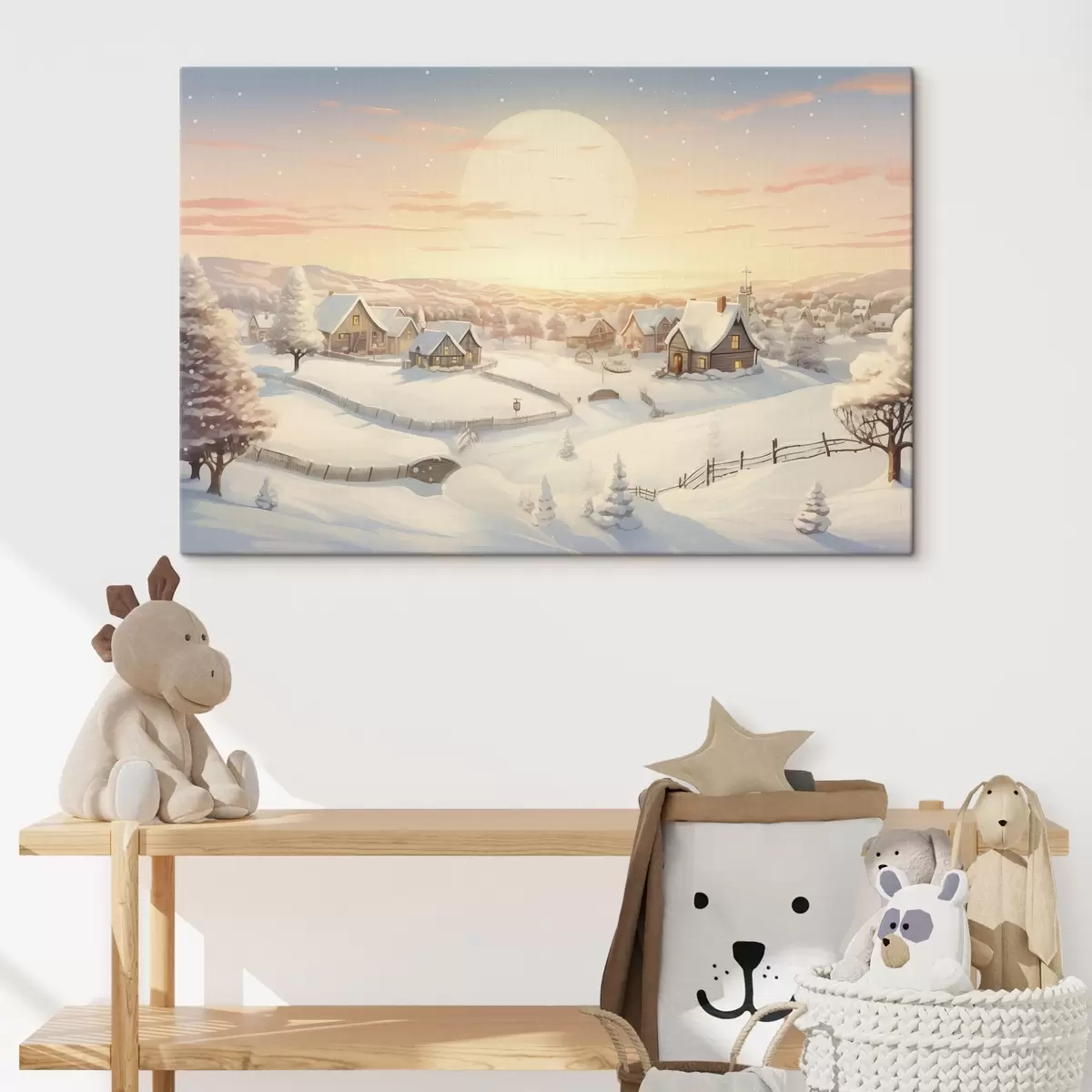 Obraz Zimná dedina pri západe slnka, domy pokryté snehom, borovice Nr. s41380