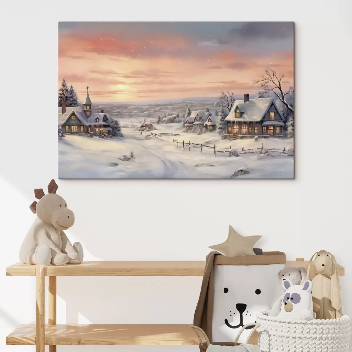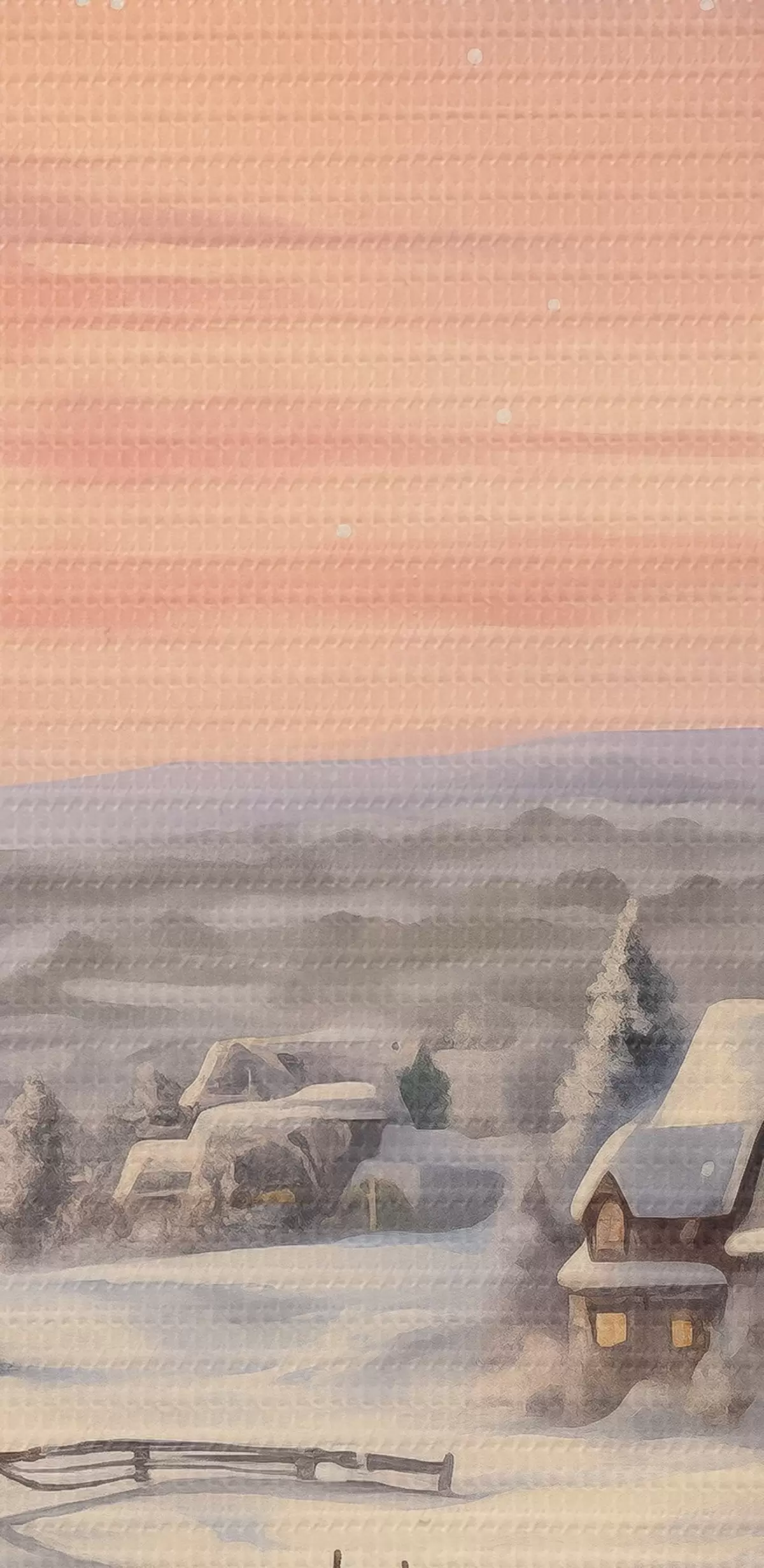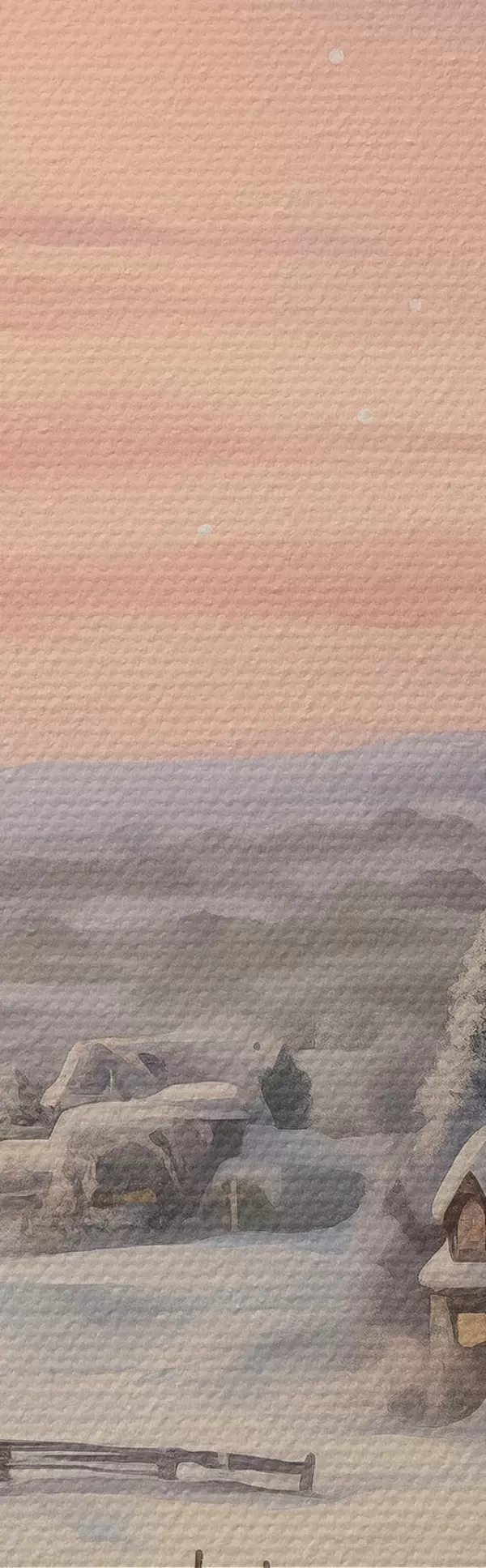 Obraz Západ slnka v zimnej dedine, rustikálne, akvarel, snehové vločky Nr. s41386