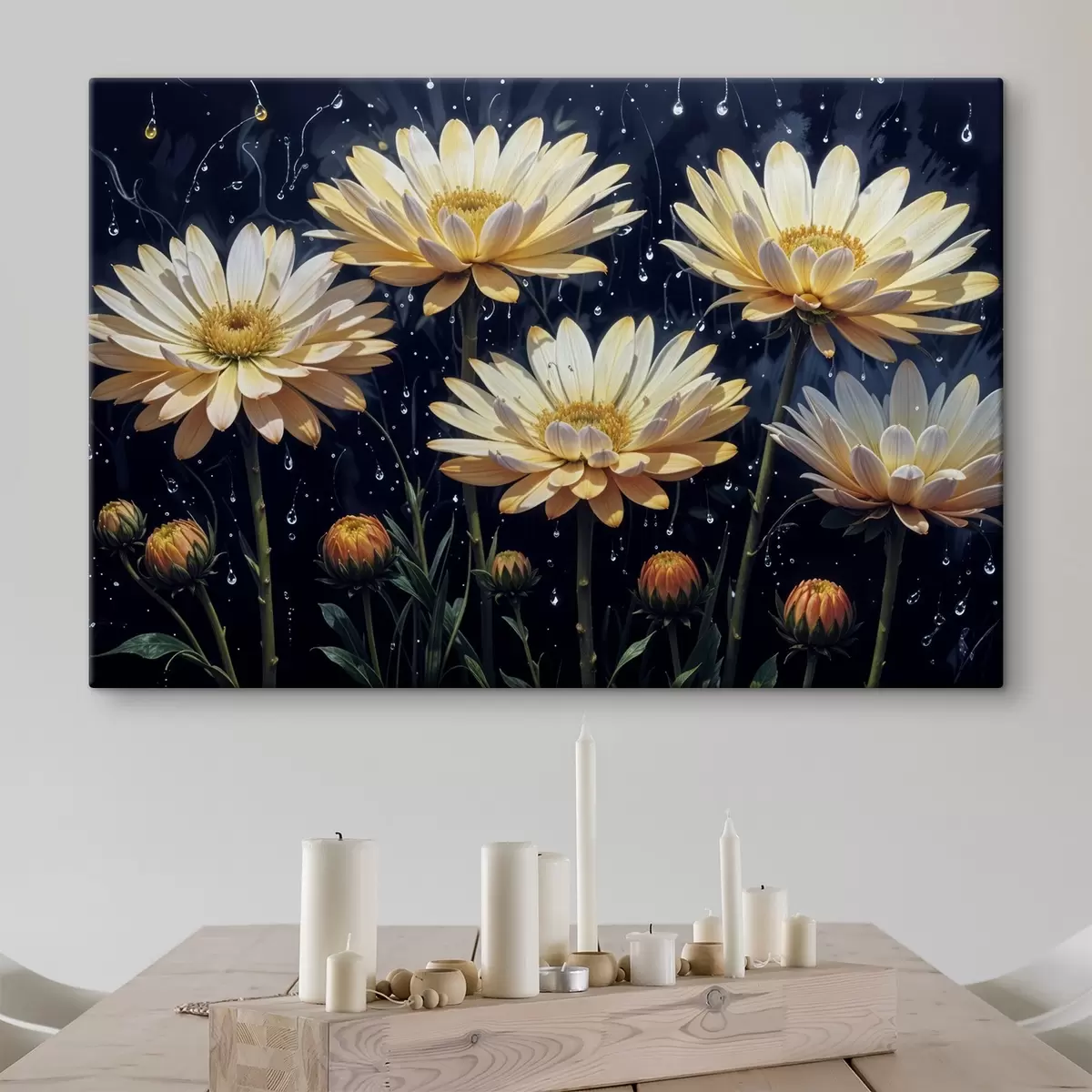 Obraz Pole veľkých žltých sedmokrások s bielymi okvetnými lístkami na tmavej nočnej oblohe s hviezdami Nr. s41718