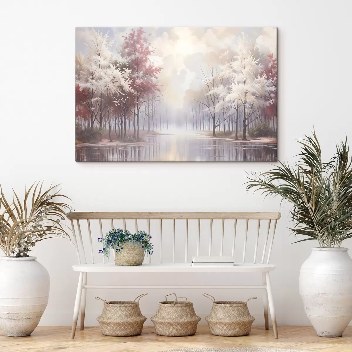Obraz Pokojná krajina s hmlistým lesom, holými stromami a pokojným jazerom odrážajúcim jemné ružové a biele tóny Nr. s41720