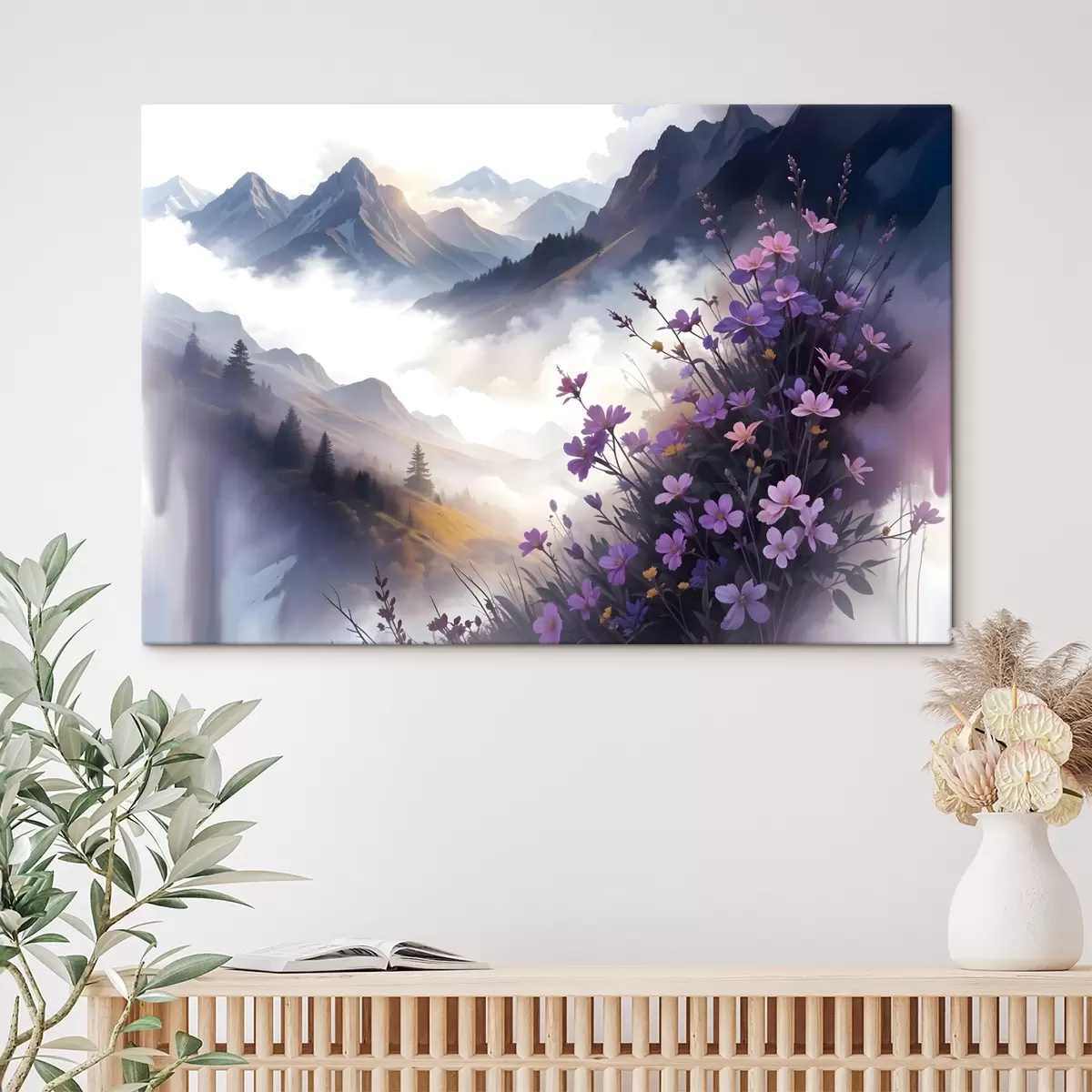 Obraz Krajina s pohorím v pozadí, obklopená sviežimi fialovými kvetmi v popredí Nr. s41724