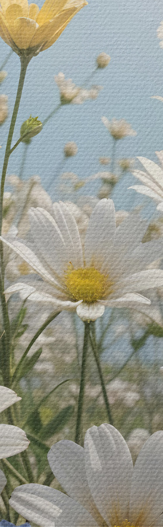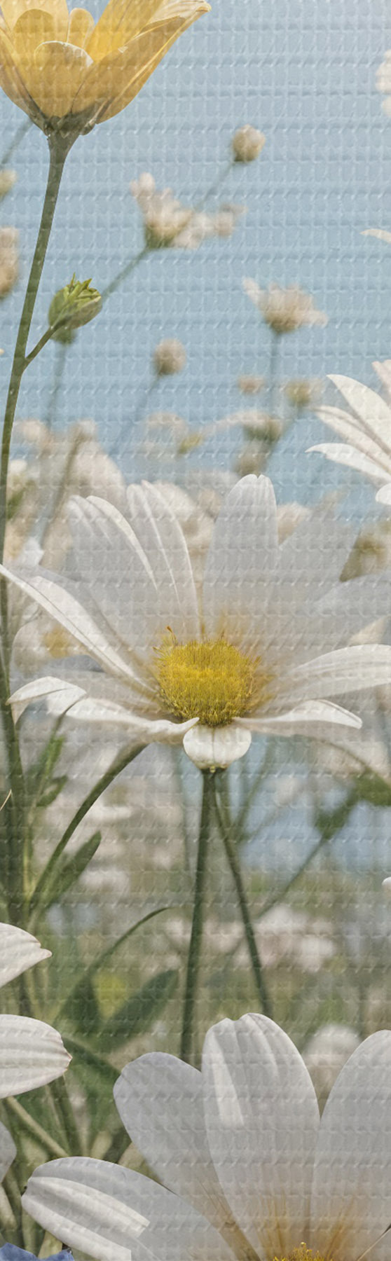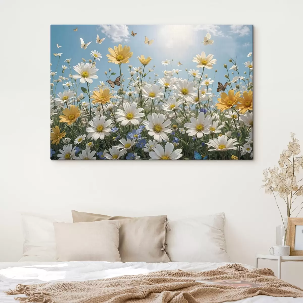 Obraz Pole bielych a žltých sedmokrások na modrej oblohe s nadýchanými bielymi oblakmi a motýľmi letiacimi nad nimi Nr. s41726