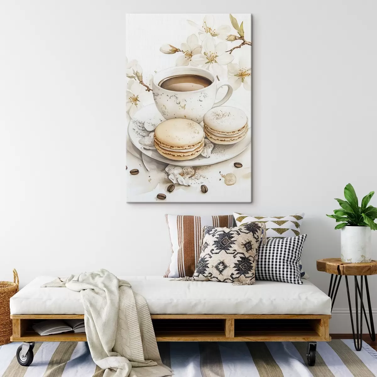 Obraz Šálka kávy s makrónkami, akvarelový štýl, jemné farby, jazmínové kvety Nr. s41949