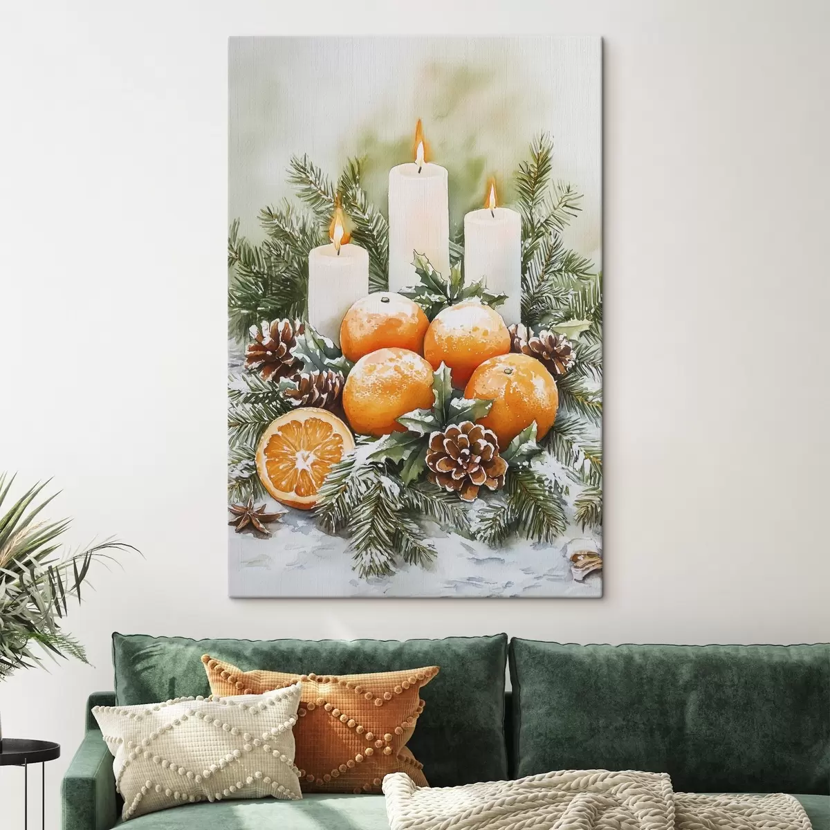 Obraz Vianočná výzdoba so sviečkami, borovicou, šiškami a pomarančmi, akvarelový štýl Nr. s41951