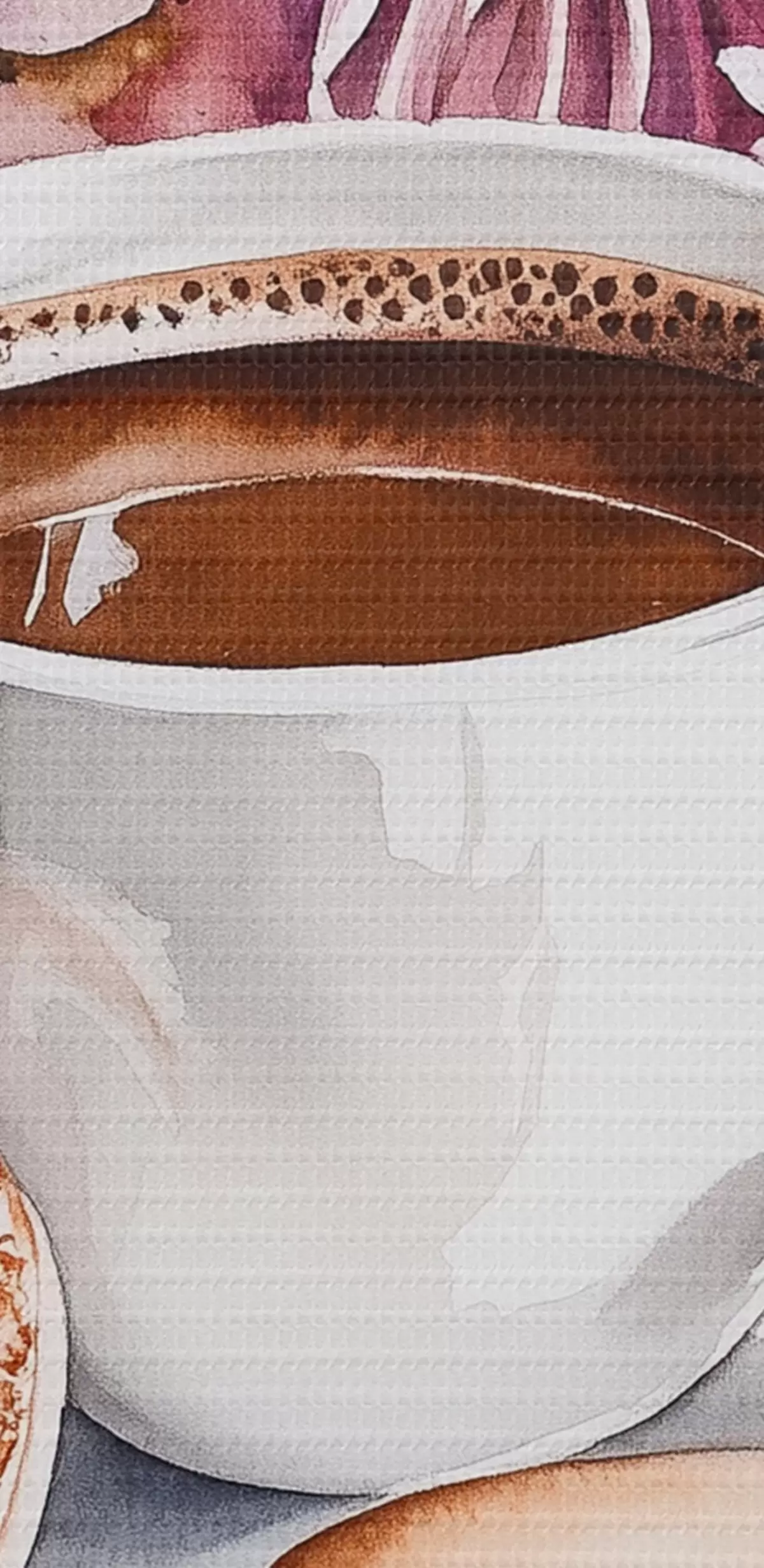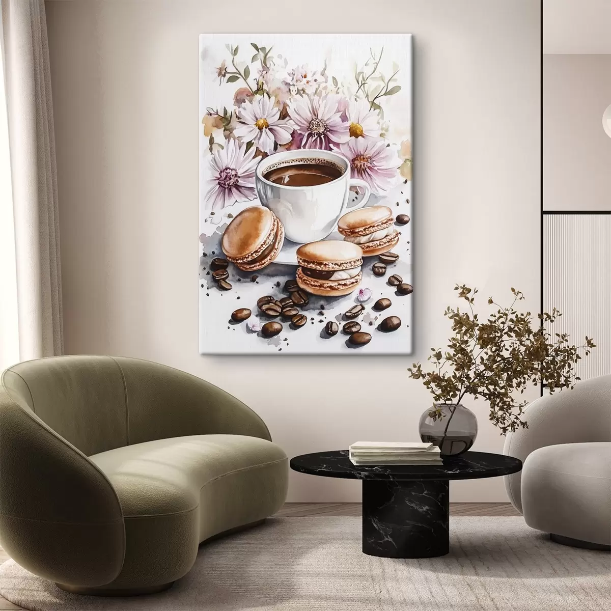 Obraz Šálka kávy s makrónkami, ružové kvety, akvarel, kávové zrná Nr. s41963