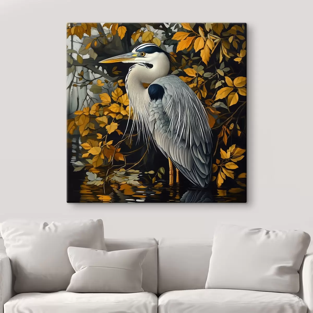 Obraz Volavka vo vode na pozadí jesenného lístia Nr. s42041