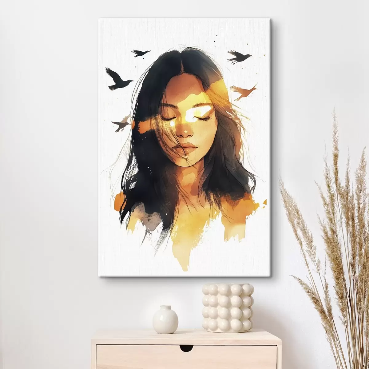 Obraz Akvarelový štýl portrétu, krásne dievča, slnečné svetlo, lietajúce vtáky Nr. s42198