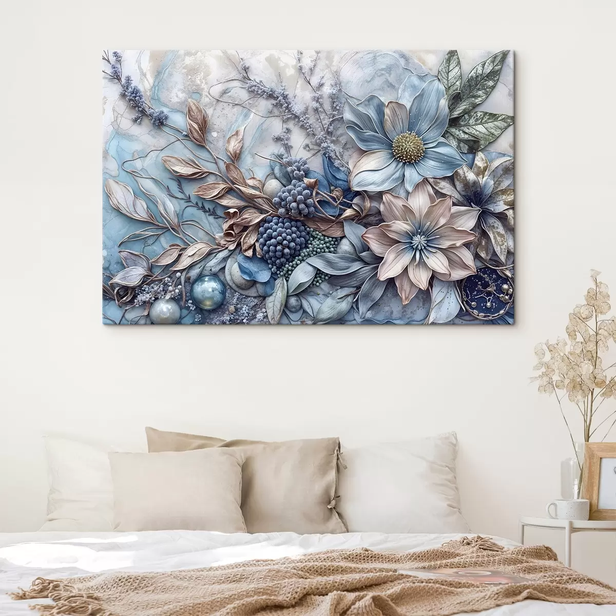 Obraz Detailná textúra abstraktných sviežich kvetov s veľkými, žiarivými modrými a ružovými kvetmi, bobuľami a inými botanickými prvkami Nr. s42210