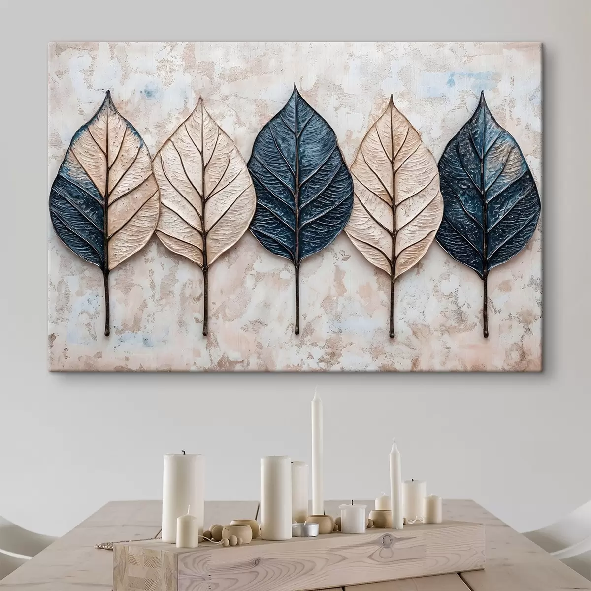 Obraz Rôzne jesenné abstraktné listy v rôznych odtieňoch hnedej, béžovej a modrej farby usporiadané v rade na svetlom pozadí Nr. s42217