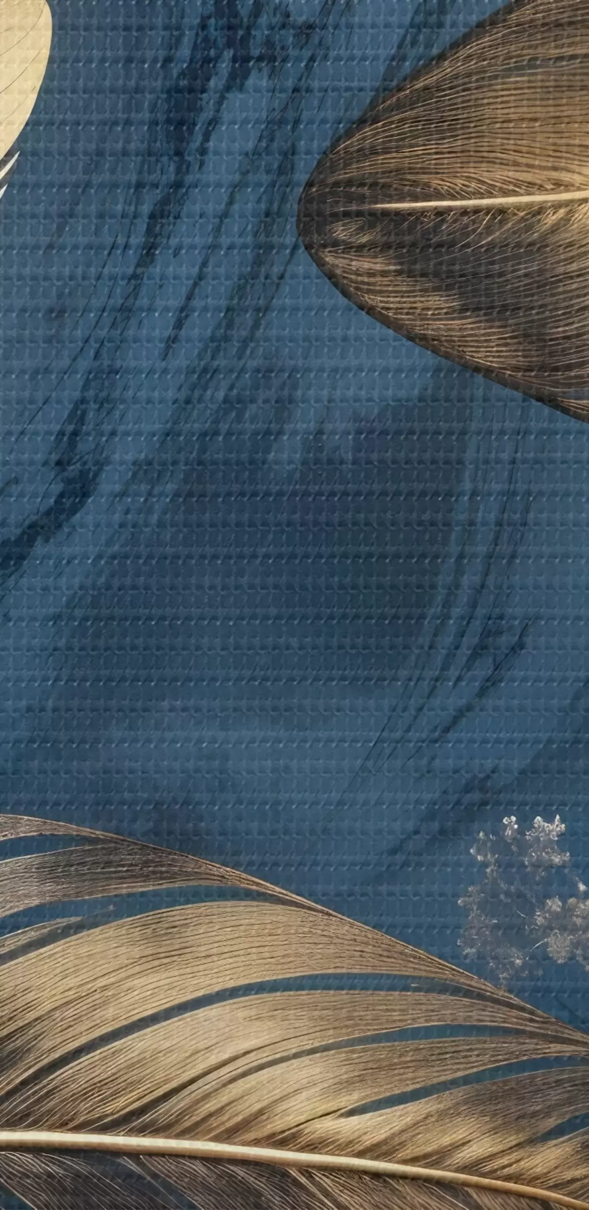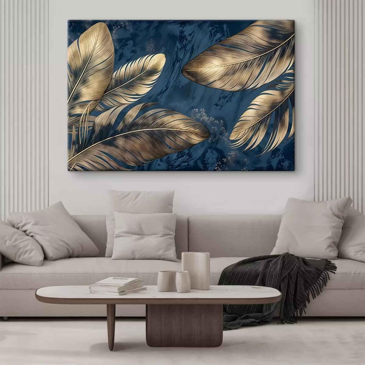 Obraz Žlté a béžové abstraktné ozdobné pierka plávajúce na tmavomodrom textúrovanom pozadí Nr. s42218