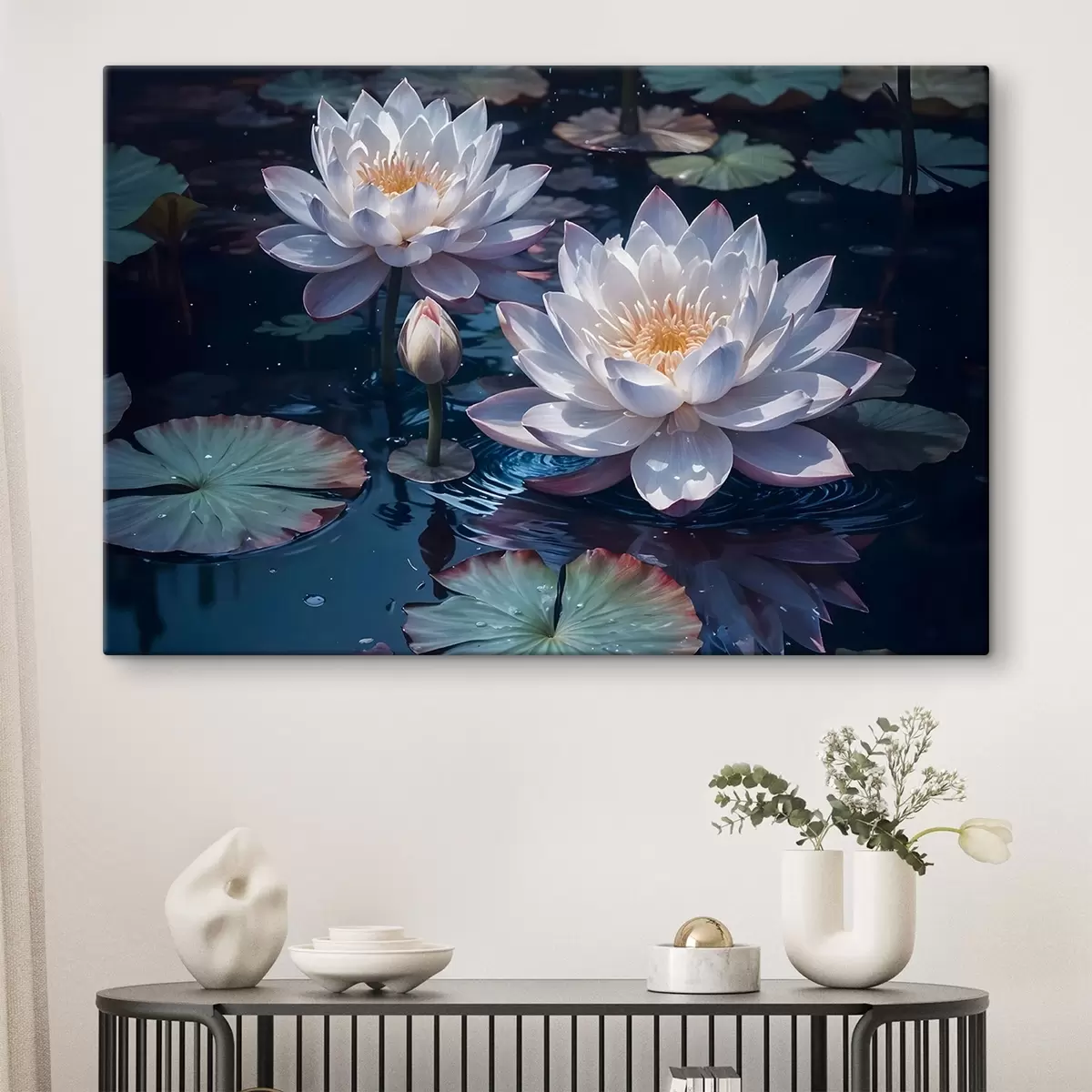 Obraz Biele lotosové kvety plávajúce na pokojnom rybníku s leknami Nr. s42225