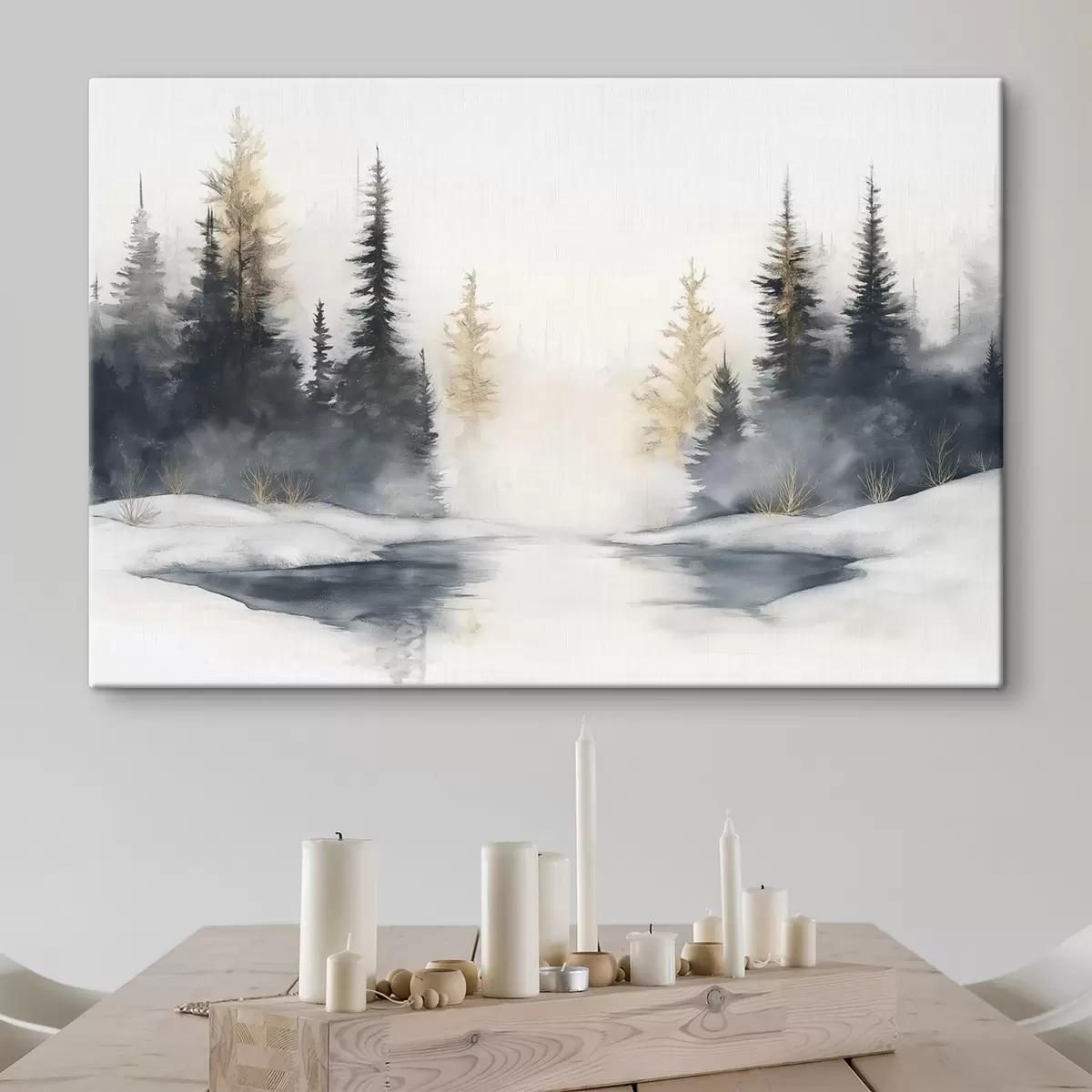 Obraz Zimná krajina s riekou a borovicami, príroda, les, hmla Nr. s42374
