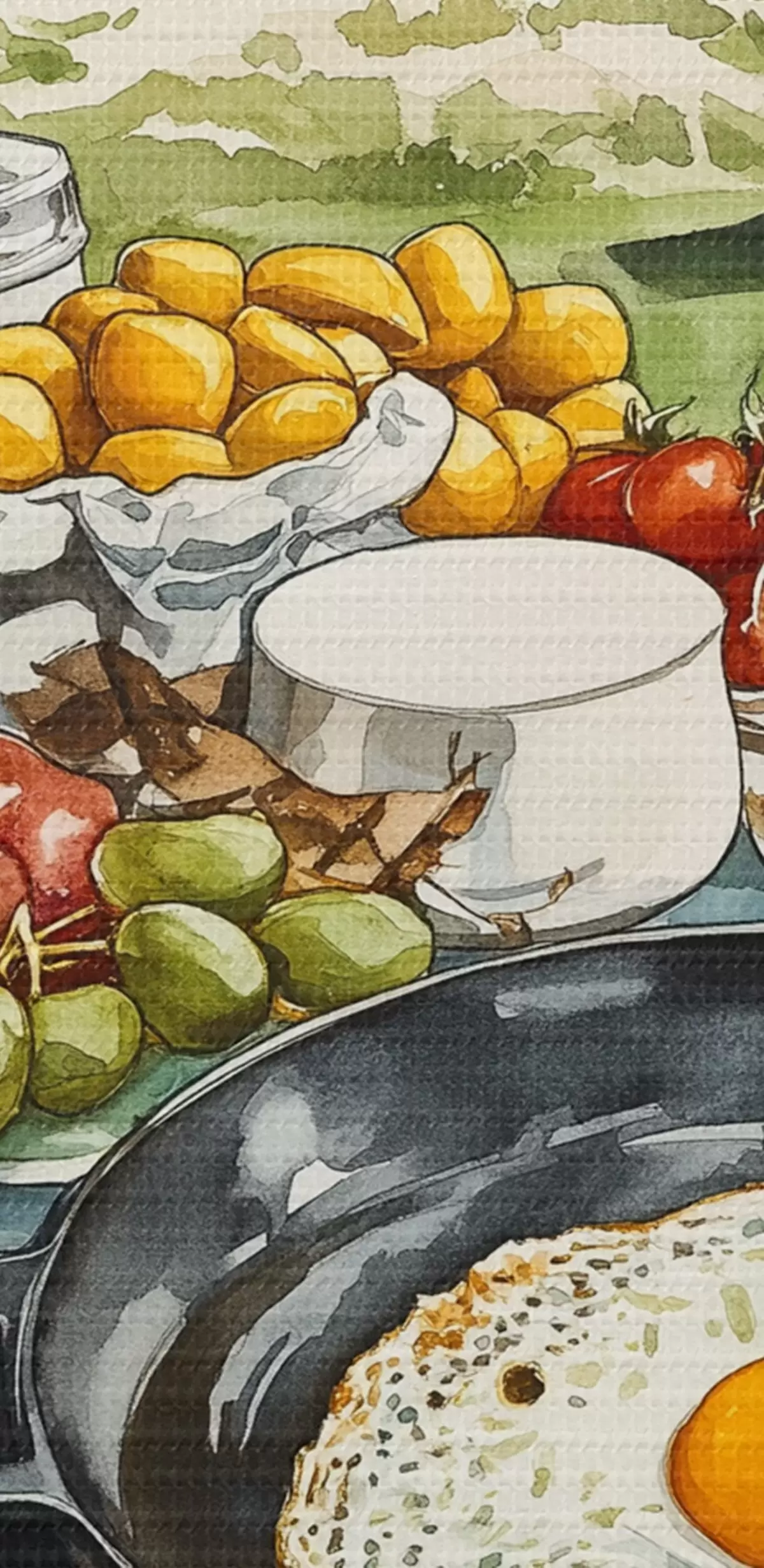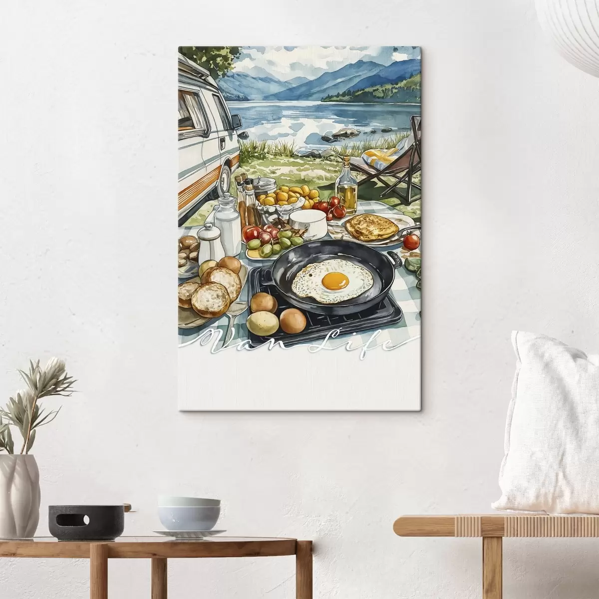 Obraz Krásne raňajky v akvarelovom štýle, život v dodávke, kempovanie, hory Nr. s42429
