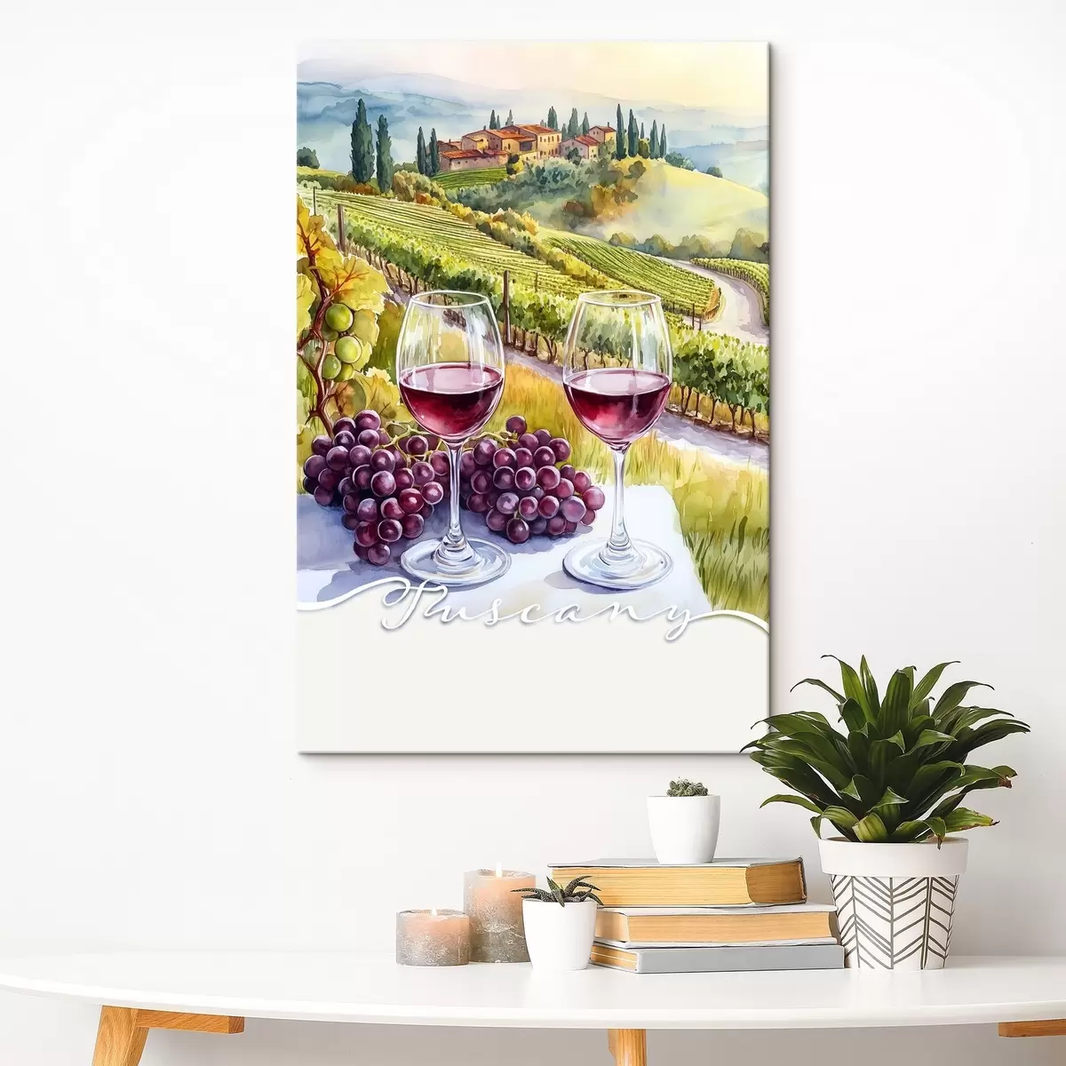 Obraz Toskánska krajina, akvarel, poháre na víno, hrozno, západ slnka Nr. s42439