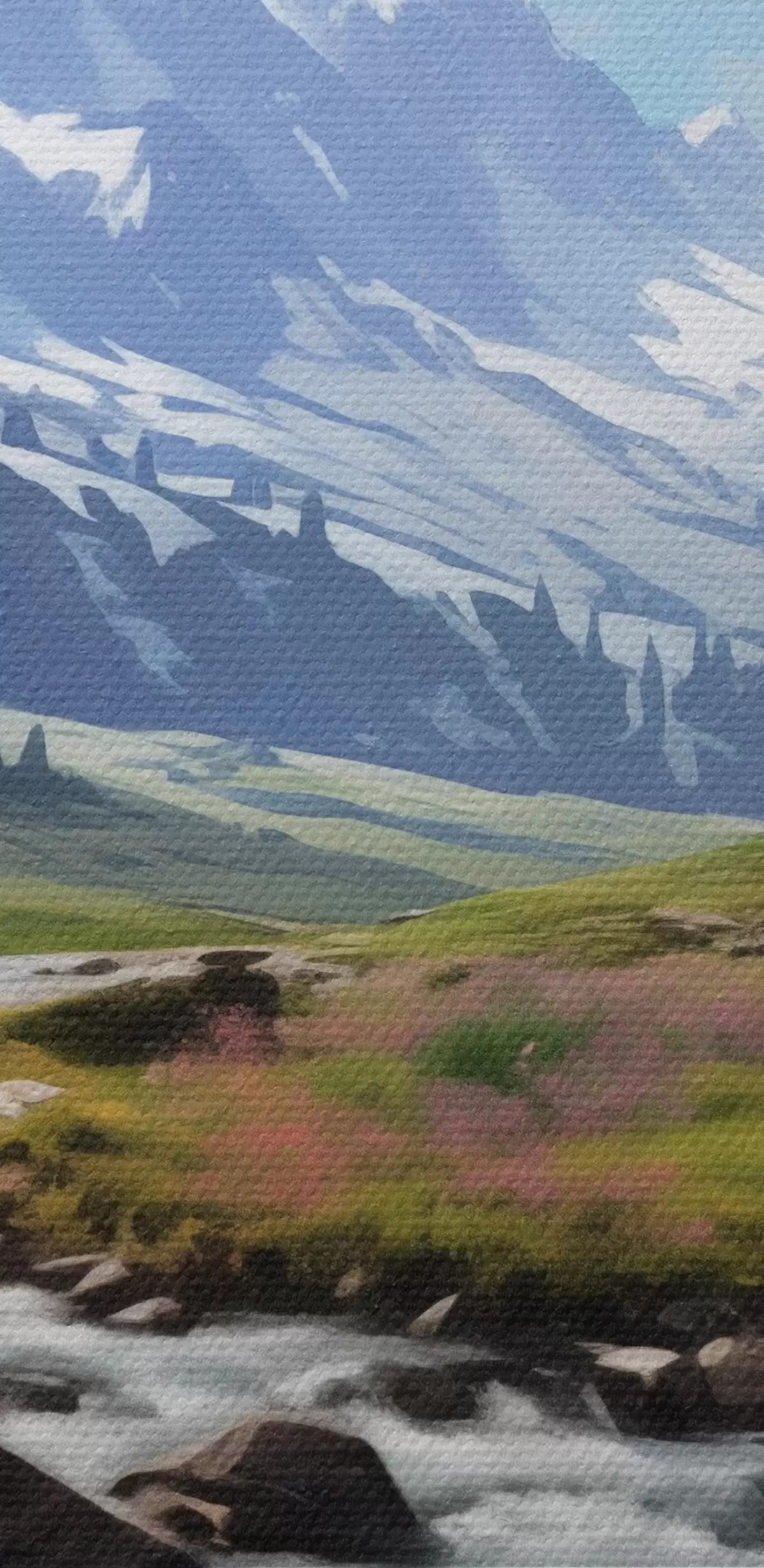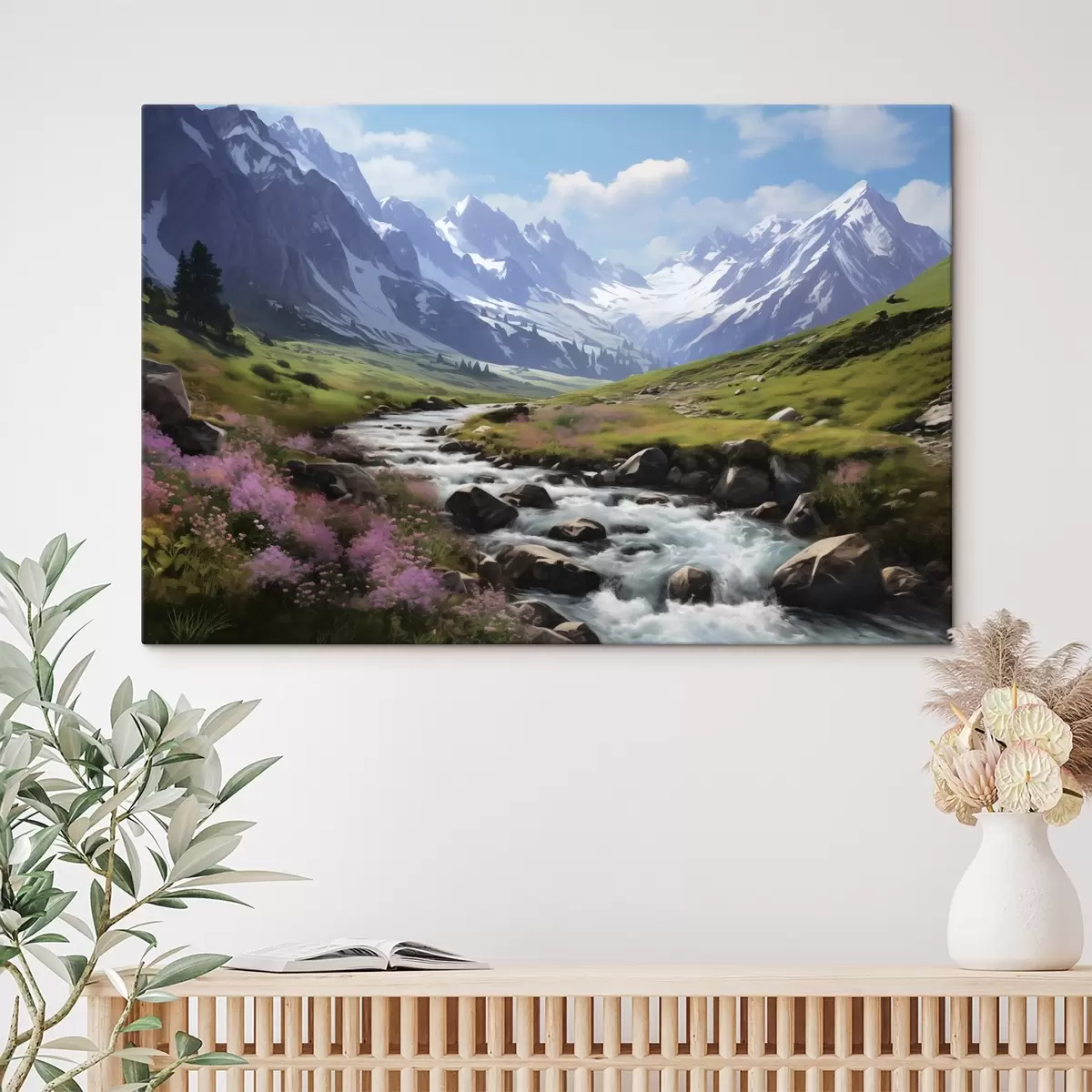 Obraz Horská krajina so zurčiacim potokom, kvitnúcimi lúkami a zasneženými vrcholmi na obzore pod jasne modrou oblohou. Nr. s42563