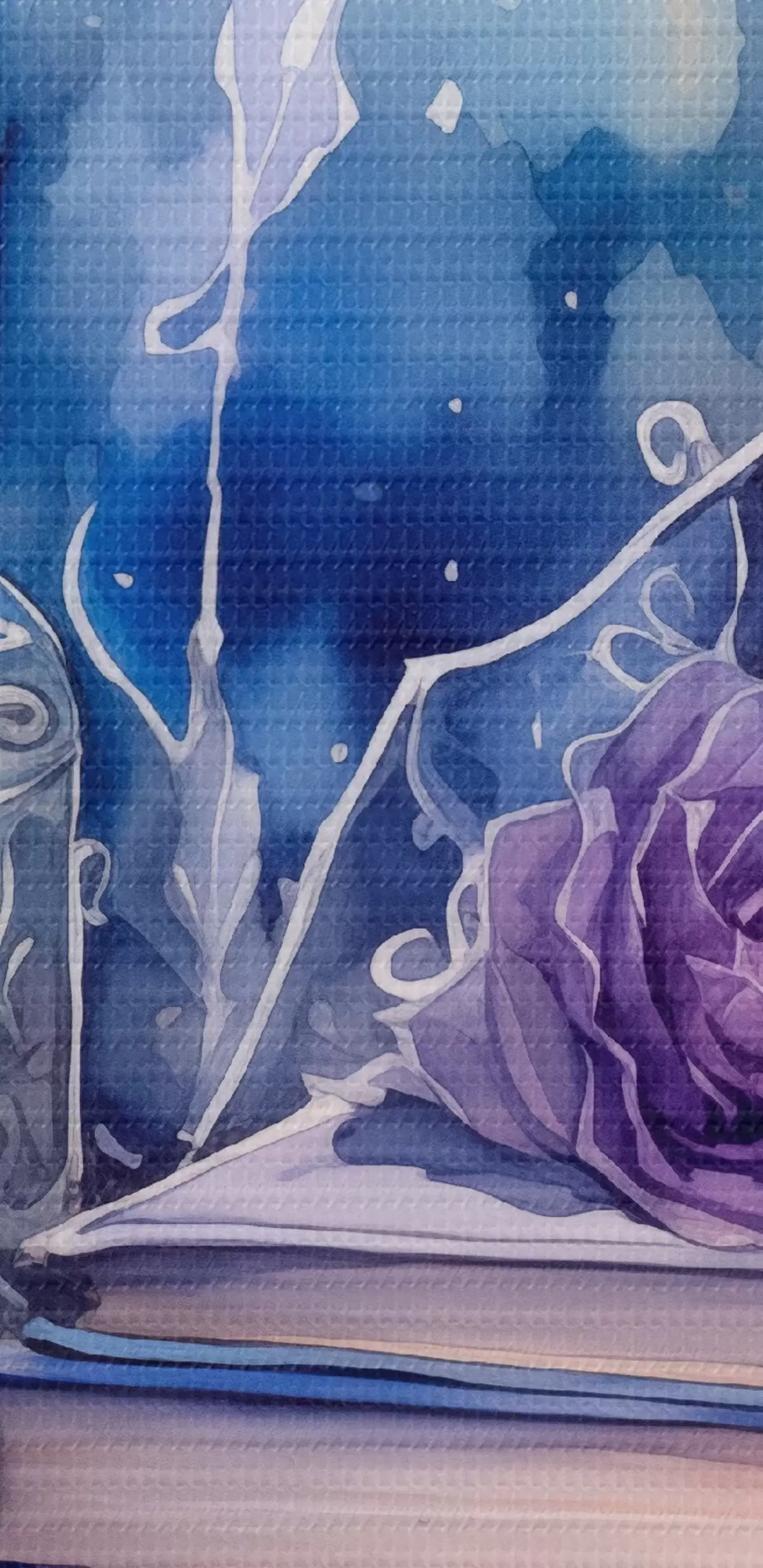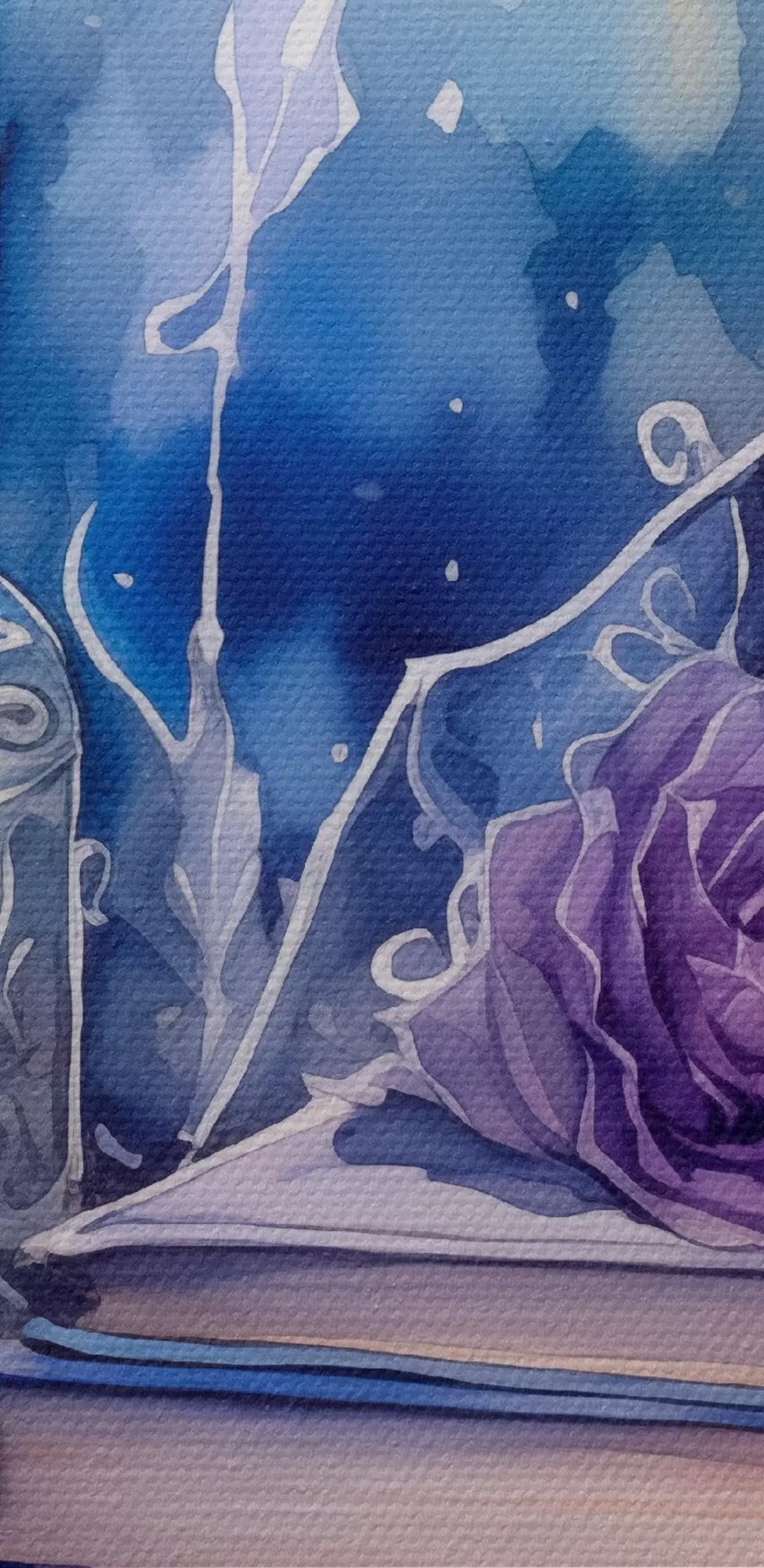 Obraz Zátišie s historickými knihami, sklenenými fľašami v modrofialových tónoch a dekoratívnymi kvetmi. Nr. s42574