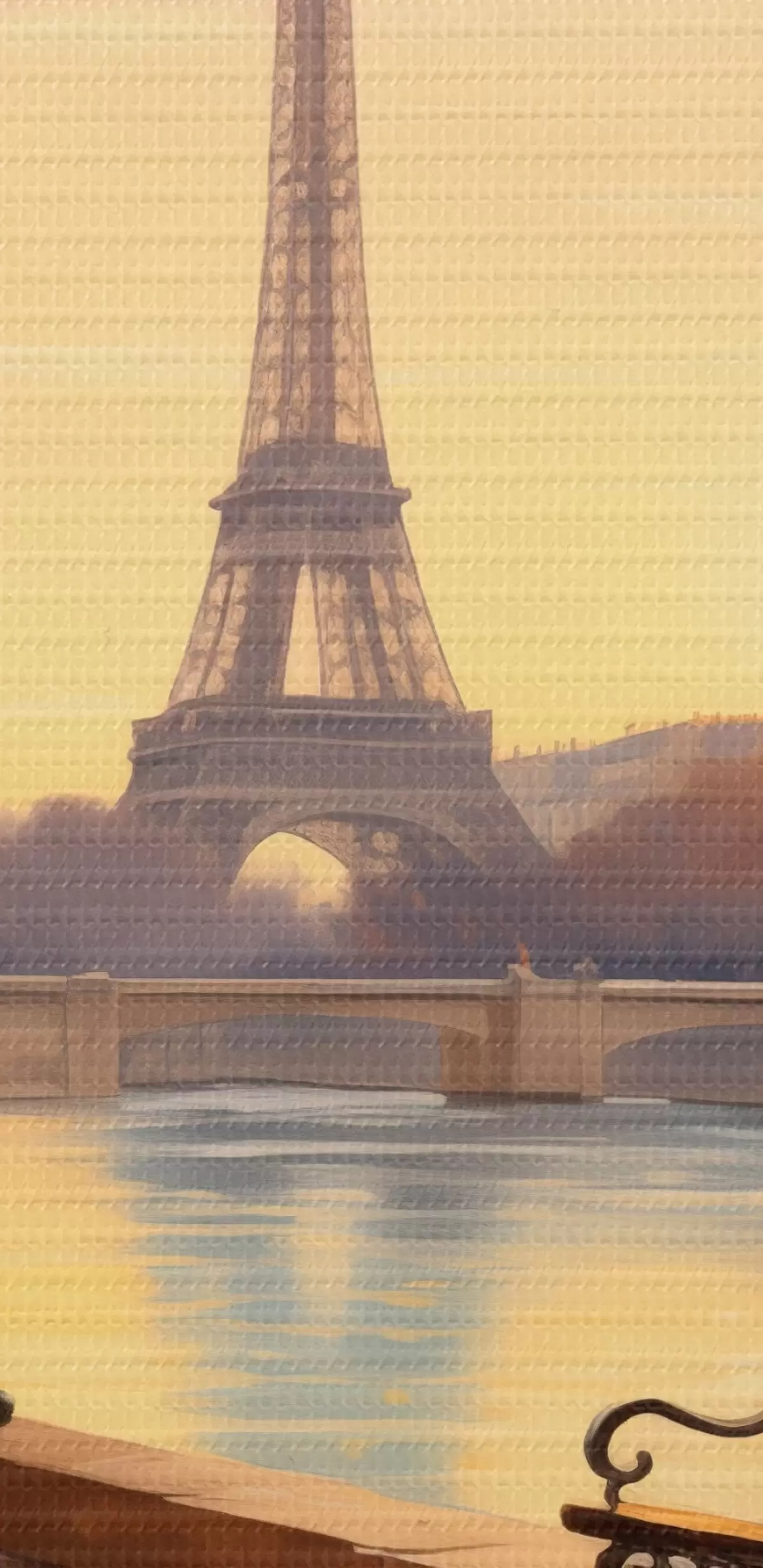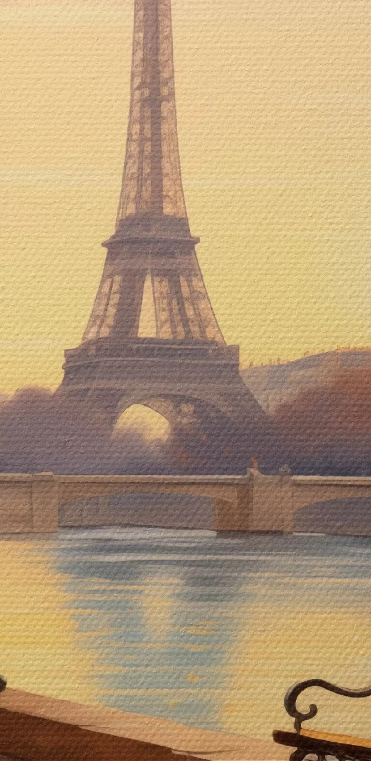 Obraz Jeseň v Paríži s výhľadom na Eiffelovu vežu, brehy Seiny pokryté lístím, lavičky a pouličné lampy dotvárajú romantickú atmosféru. Nr. s42577