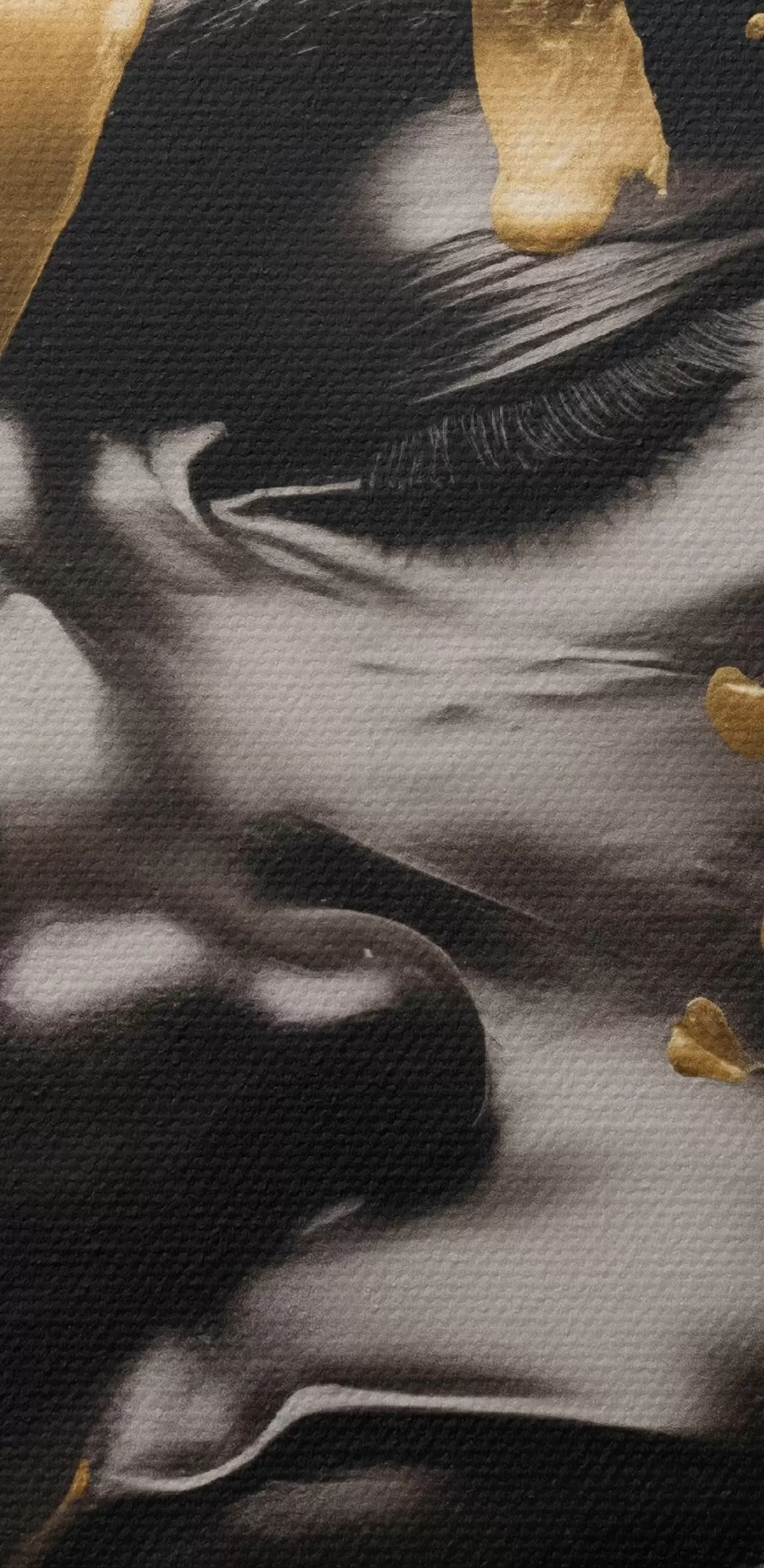 Obraz Abstraktný portrét muža v hladkých čiernobielych tónoch, zvýraznený jasnými teplými ťahmi štetca, ktoré vytvárajú dynamický efekt. Nr. s42623